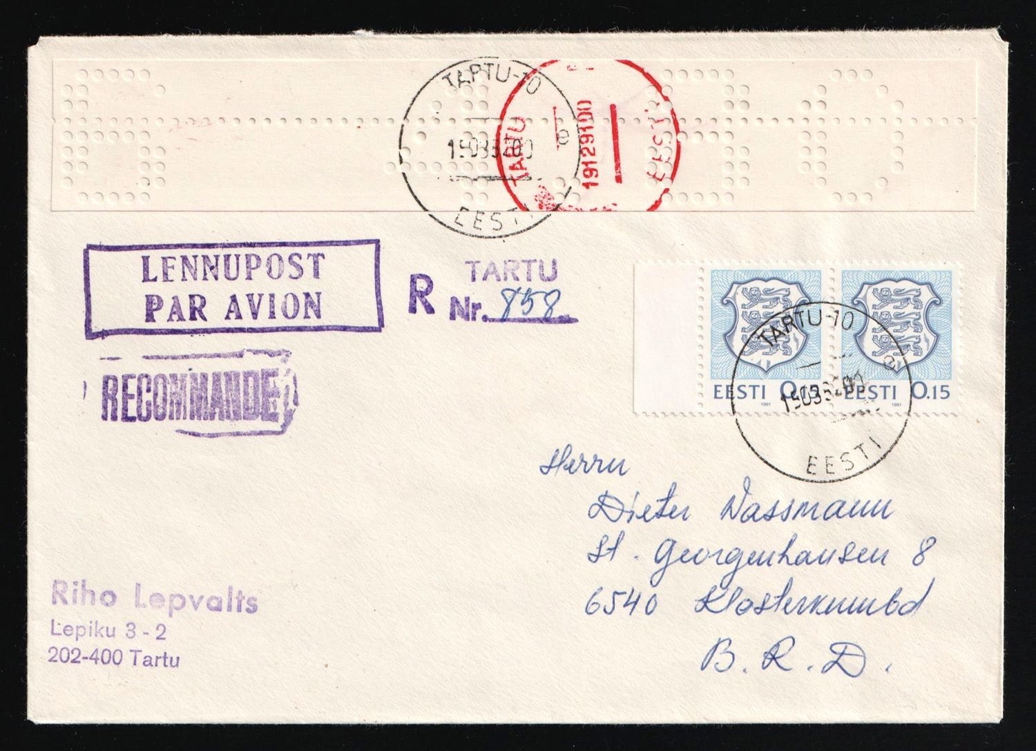 2093 image1992 (19 Dec) Estonia, Registered Airmail Cover from Tartu to Germany with white punched tape for 4.80r and additional franking of 0,15k of pair new final 'Wappen' series. | Michel 167 (Image 1) (Image 2)