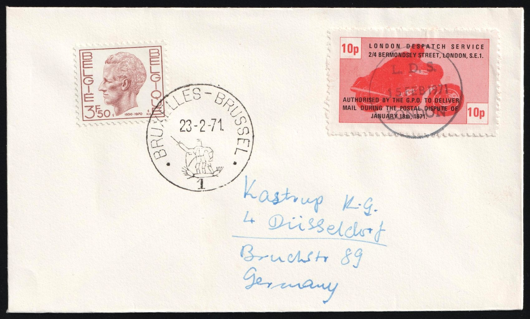 2112 image1971 (15 Feb) Commercial Cover from London (Great Britain) via Brussels (Belgium) to Dusseldorf (Germany) franked with mixed franking of Great Britain Private Post Office in London 'L. D. S.' 10p and Belgium 3.5fr. | Michel 1649 (Image 1) (Image 2)