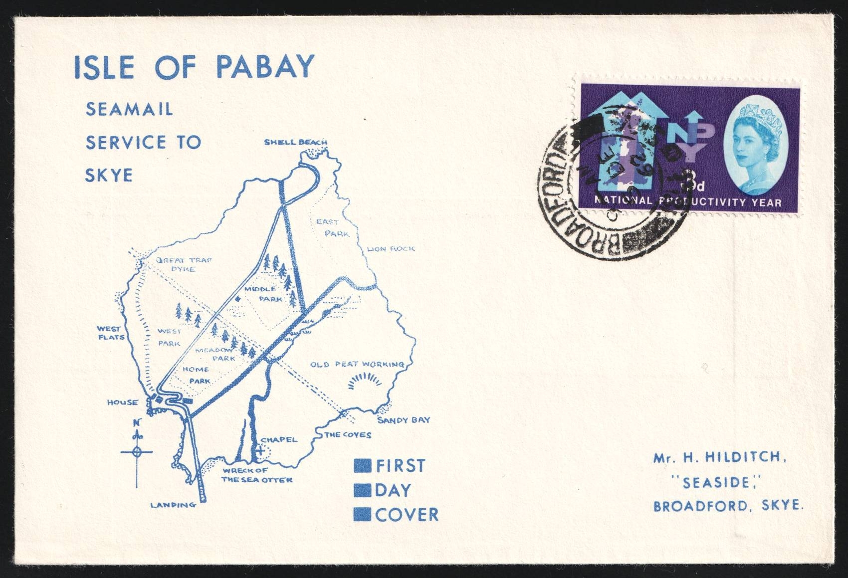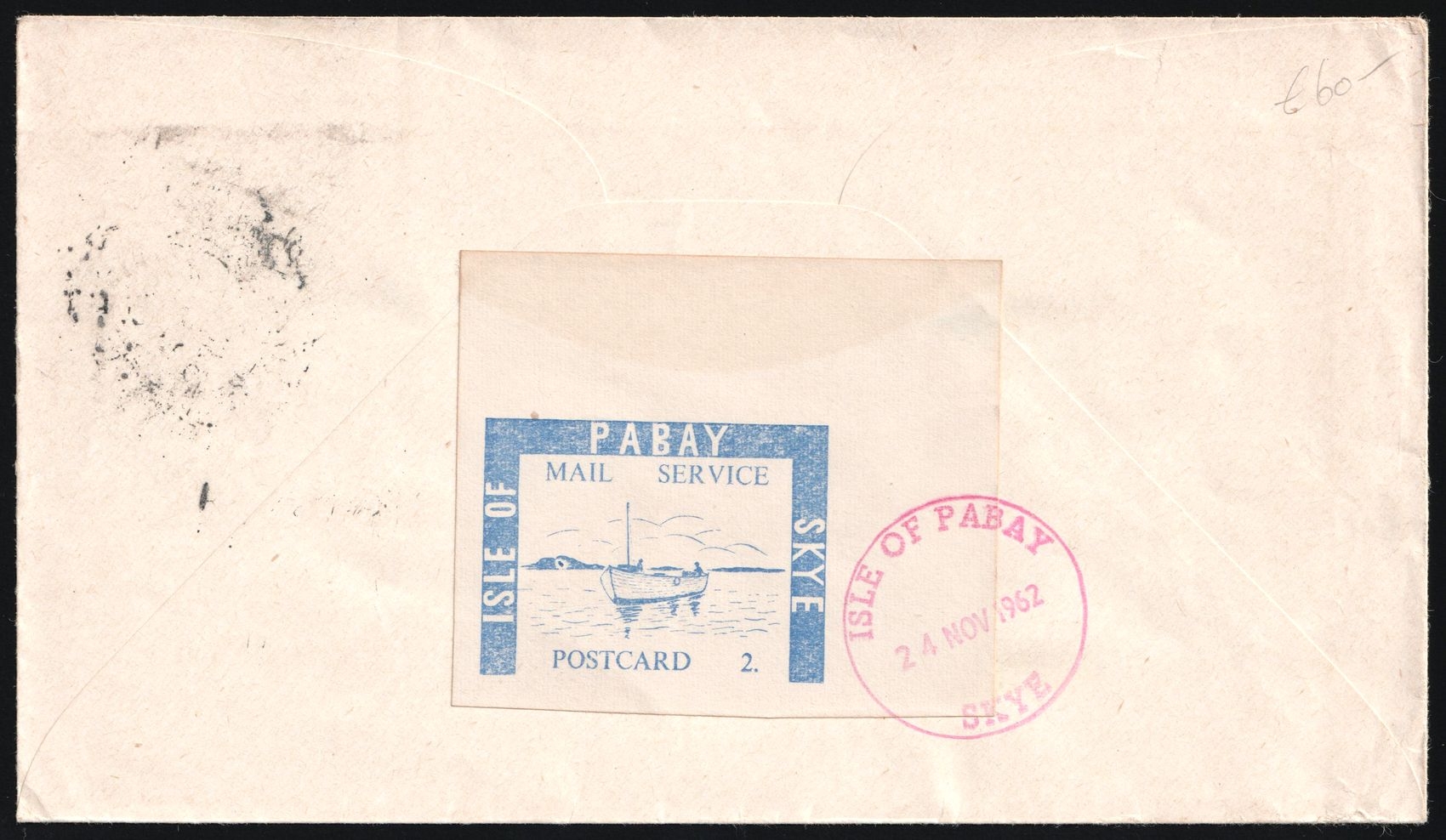 2107 image1962 (3 Dec) Local First Day Cover, Sea Mail Service from the Isle of Pubey to Skye (Great Britain), franked with 3d Great Britain and the complete set of Lundy on the backside. (Image 1) (Image 2)