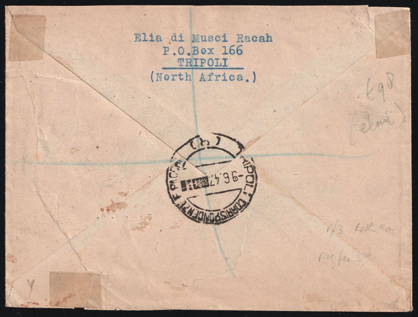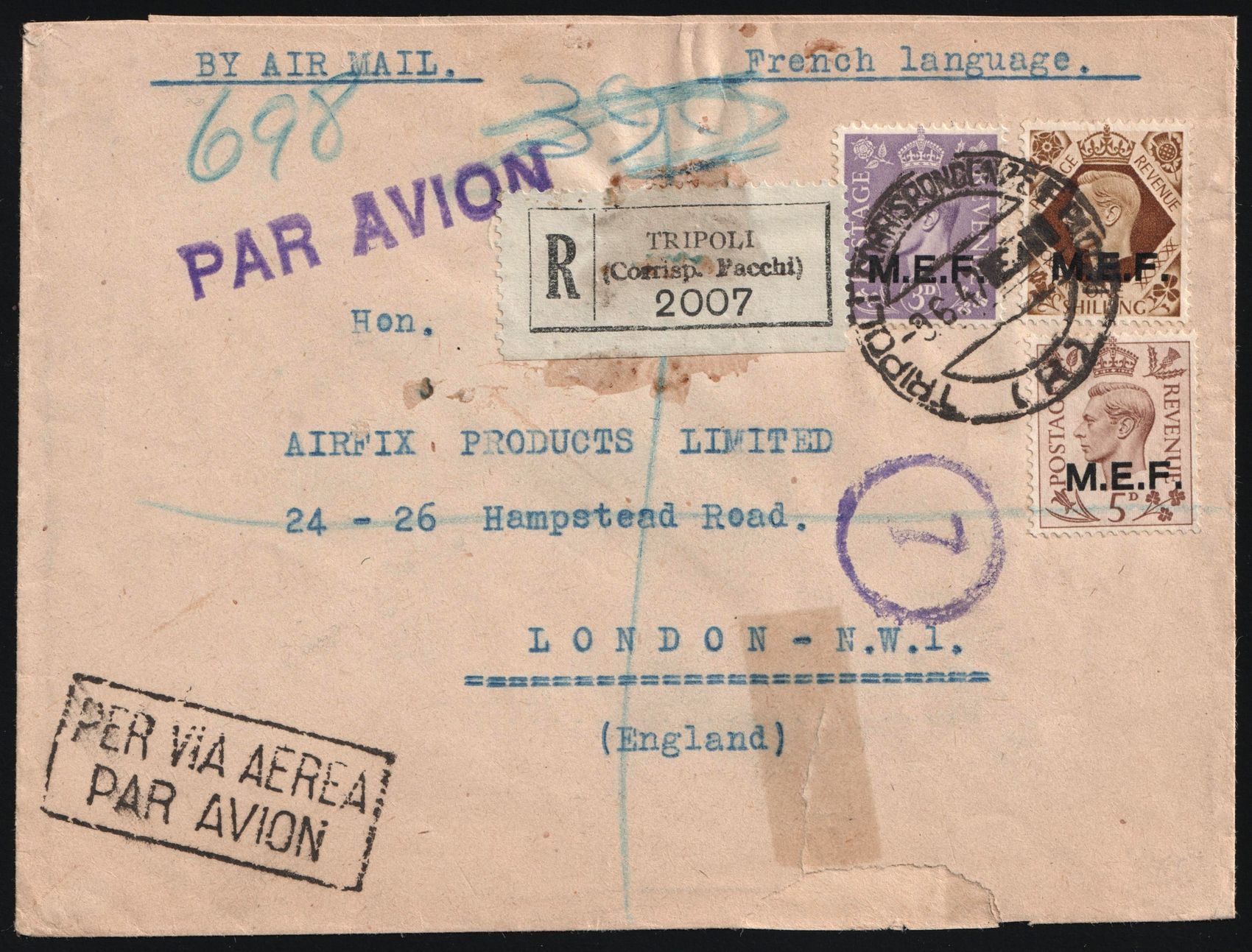 2117 image1947 (3 Jun) British Occupation of Italian Colonies, Middle East Forces, International Registered Airmail Cover from Tripoli (Libya) to London (England), franked with 3d, 5d and 1s. Light creases and tears. | Stanley Gibbons M14, M15, M18 (Image 1) (Image 2)