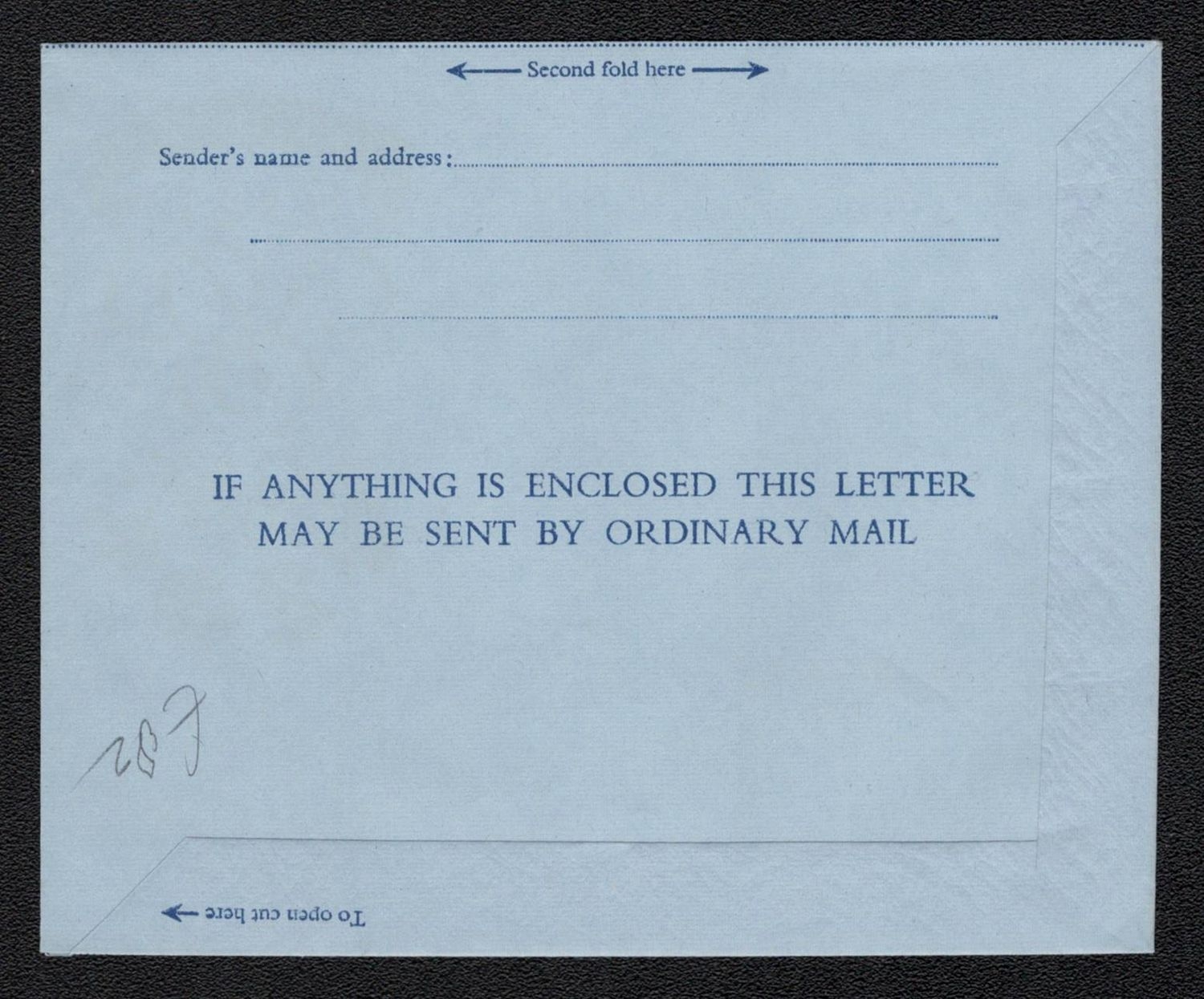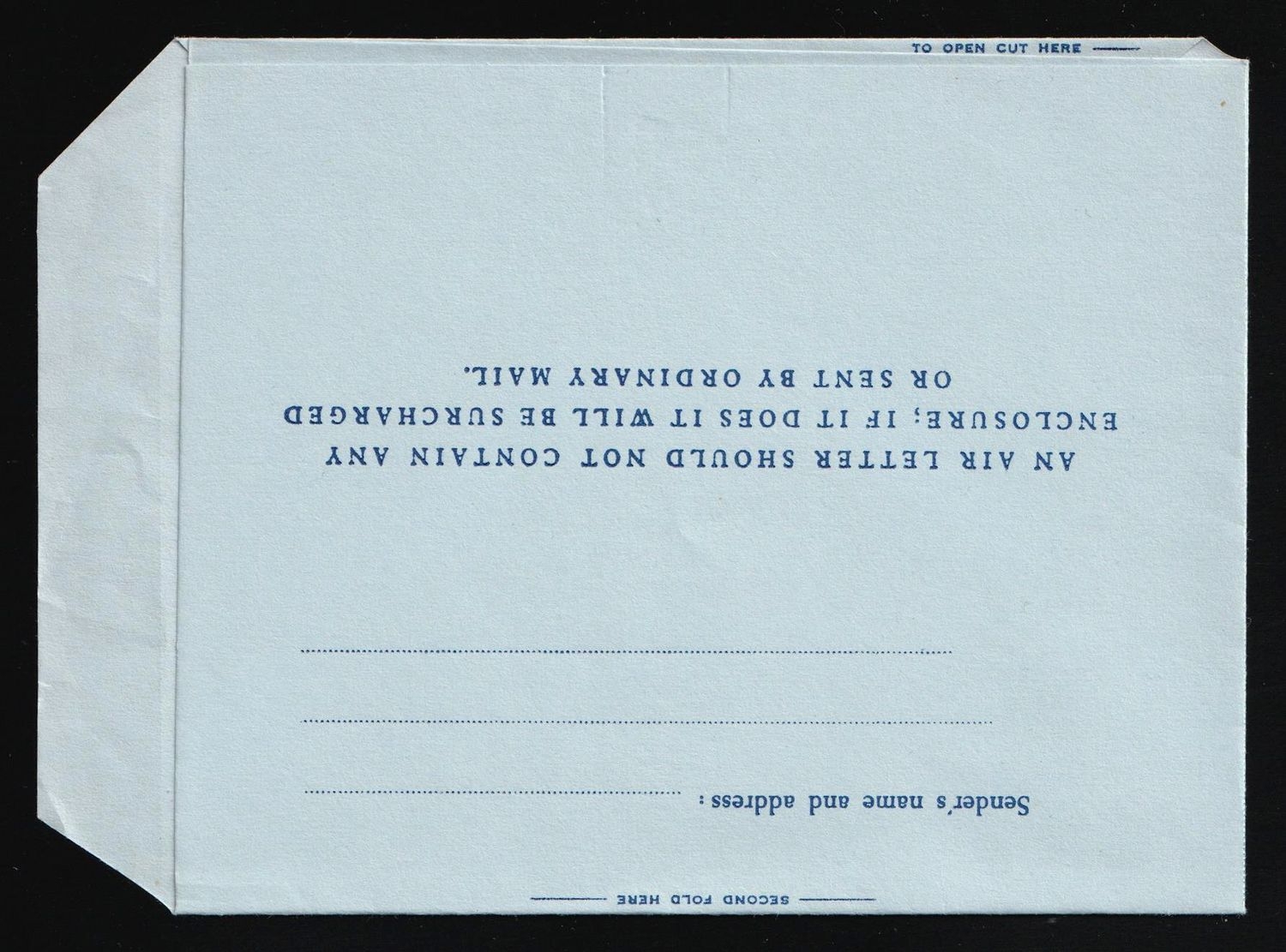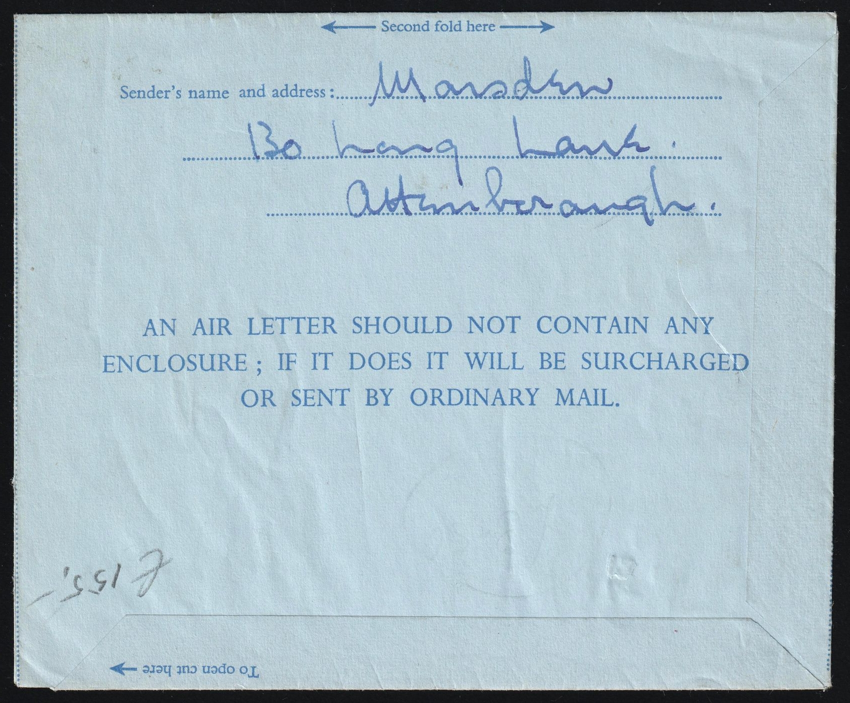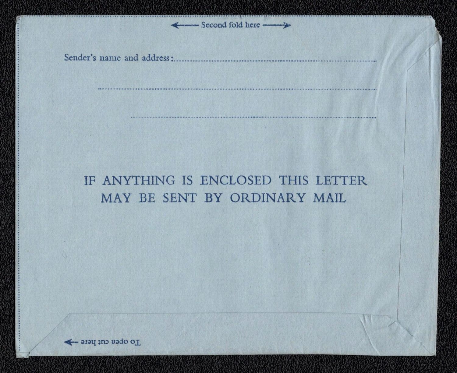 2103 image1957 (12 Sep) Great Britain Airmail Postal Stationery Cover from Beeston (Nottinghamshire, England) to Marsden (England), franked with FDC (First Day Cancellation) 4d. Small hole and very light creases. (Image 1) (Image 2)