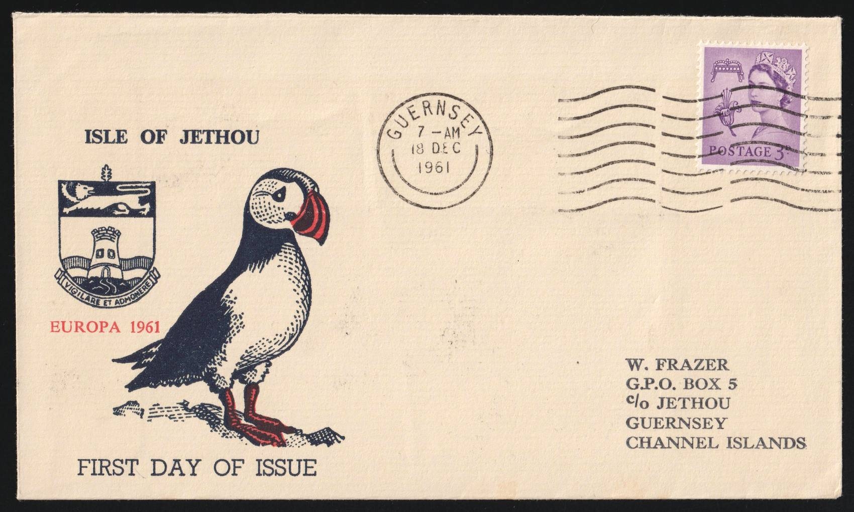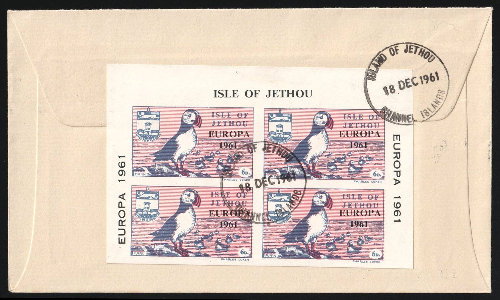2104 image1961 (18 Dec) Jethou Island, Guernsey, Great Britain, Local, First Day Cover FDC, franked with 3d and 6d of Souvenir Sheet 'Europa 1916' Jethou Isle on the backside. (Image 1) (Image 2)