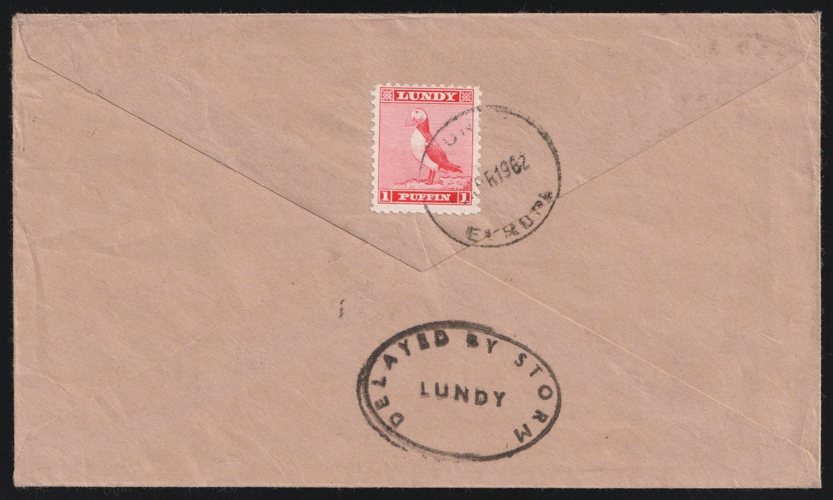 2105 image1962 (10 Apr) Local Cover from Lundy Island (Great Britain) to Roanne (France), mixed franked with 2d and 4d Great Britain and 1d Lundy on the backside (with black oval handstamp 'Delayed by storm'). (Image 1) (Image 2)