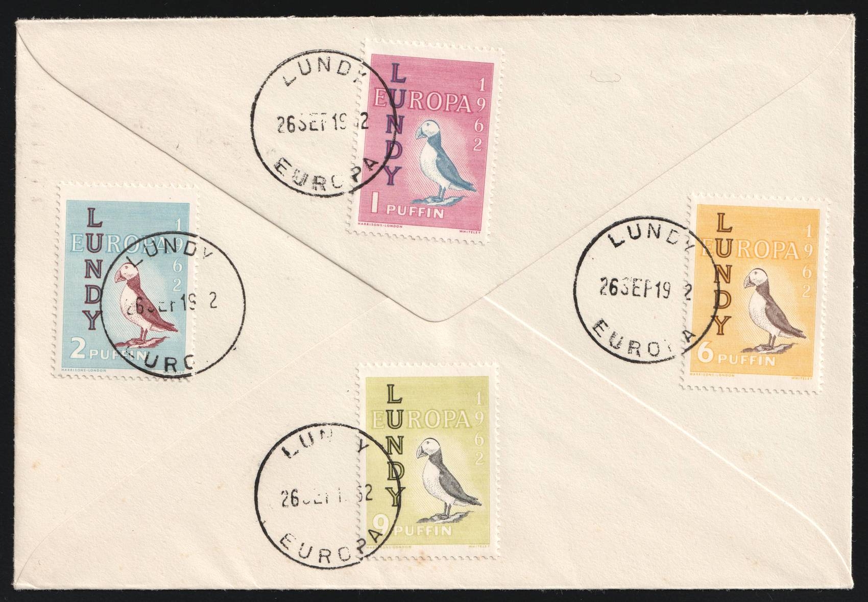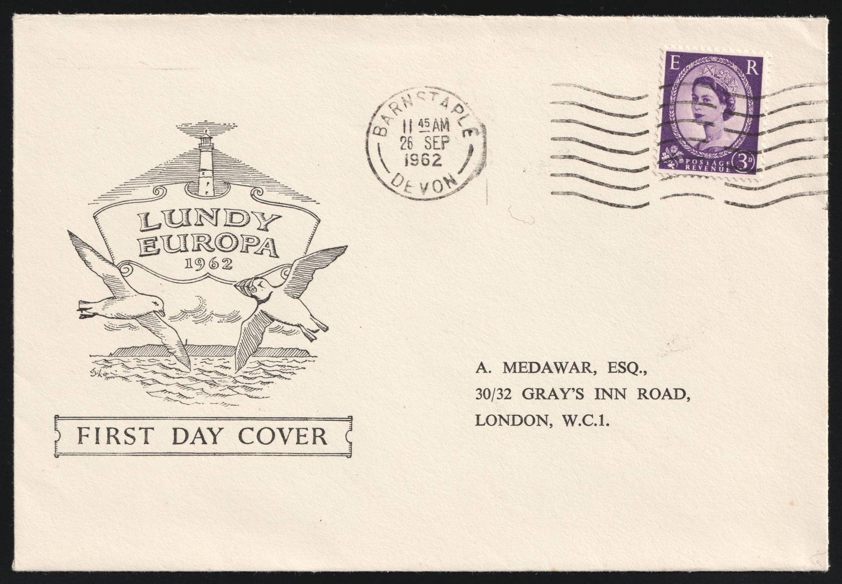 2106 image1962 (26 Sept) 'Europa' Local First Day Cover from Lundy Isle to London (Great Britain), franked with 3d Great Britain and the complete set of Lundy on the backside. (Image 1) (Image 2)