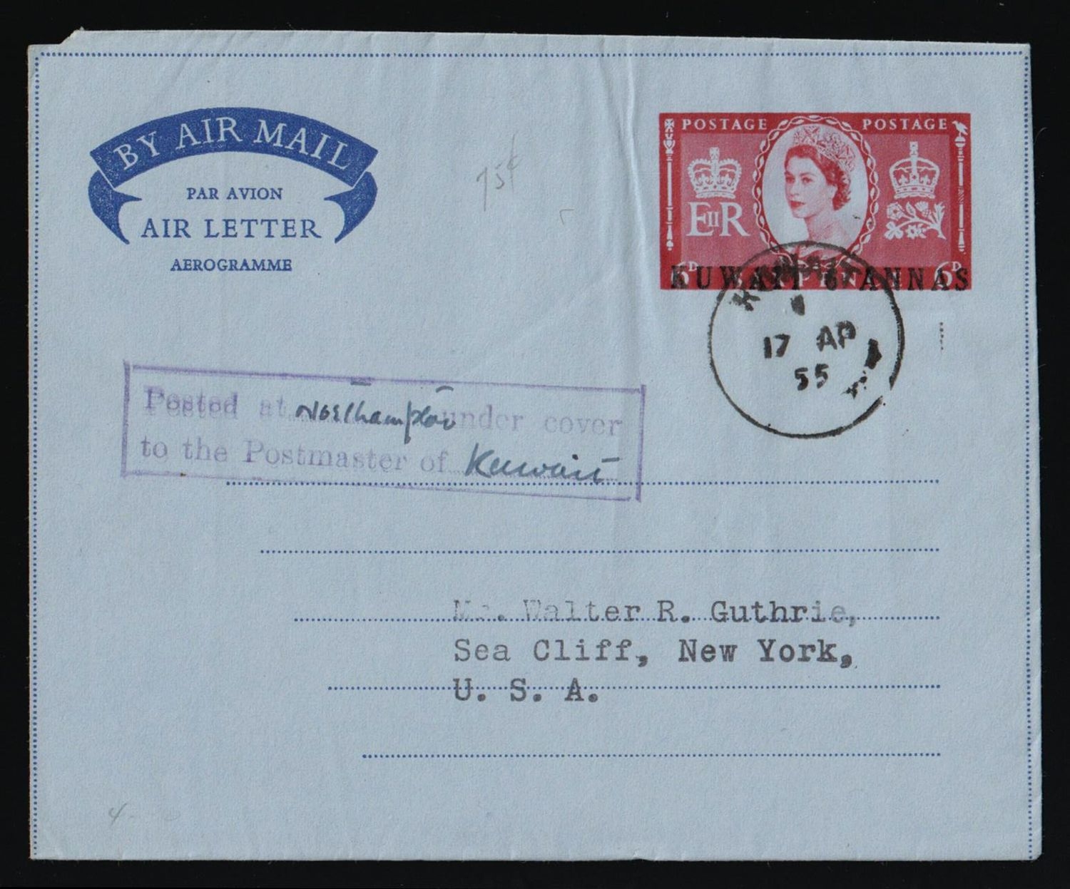 2125 image1955 17 (Apr) 6a on 6p Kuwait, British Protectorate, Air Letter, Postal Stationery Aerogram Cover from Al 1953 17 (Apr) Kuwait to Sea Cliff, New York (USA), with Violet Handstamp 'Posted at Northampton Under Сover to the Postmaster of Kuwait'. (Image 1) (Image 2)