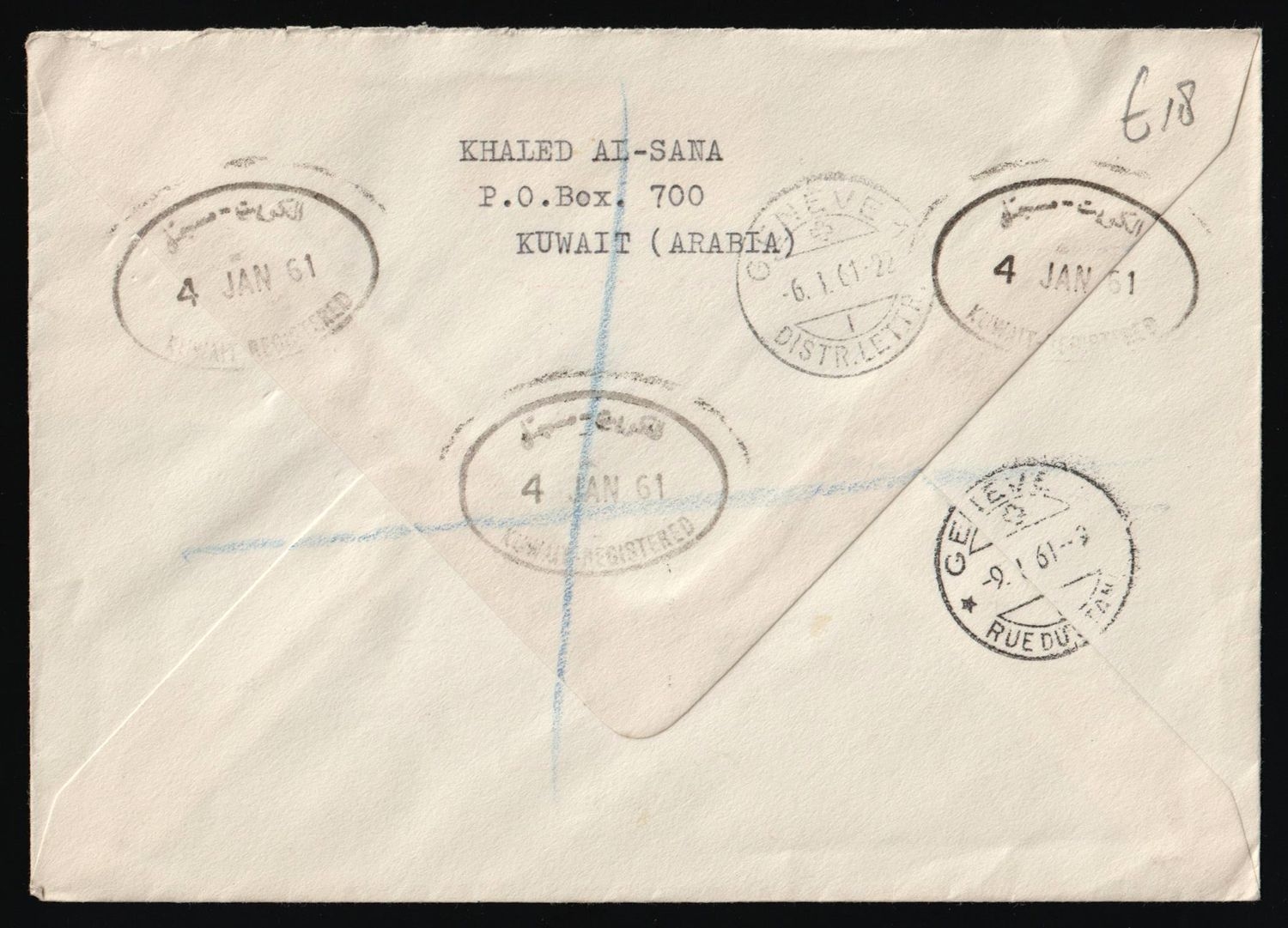 2133 image1961 4 (Jan) Kuwait, British Protectorate, Registered Airmail Cover from Al Kuwait to Geneve (Switzerland), redirected to Rue du Mont-Blanc, Geneve (Switzerland) franked with 50np, 60np. | Michel 137, 144 (Image 1) (Image 2)