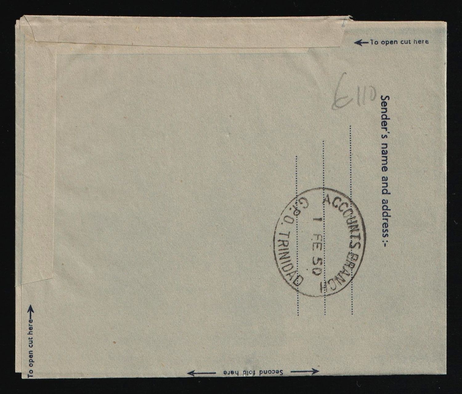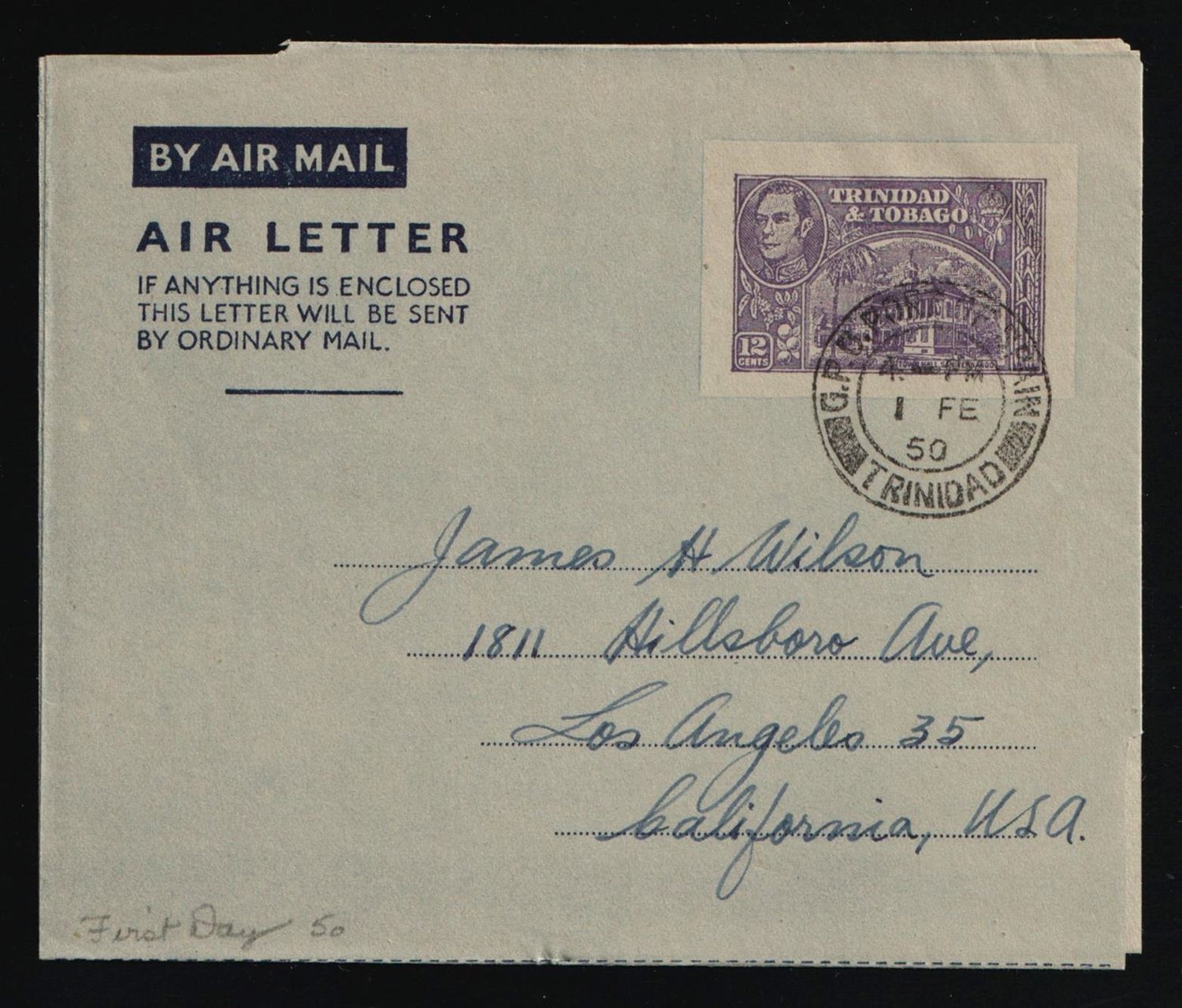 2134 image1950 (1 Feb) Trinidad and Tobago, British Commonwealth, First Day Postal Stationery Airmail Cover, Air Letter, Aerogramme from General Post Office in Port of Spain (Trinidad and Tobago) to Los Angeles (California, United States), with black Postmark 'Accounts Branch / G.P.O. Trinidad', additionally franked with 12c. (Image 1) (Image 2)