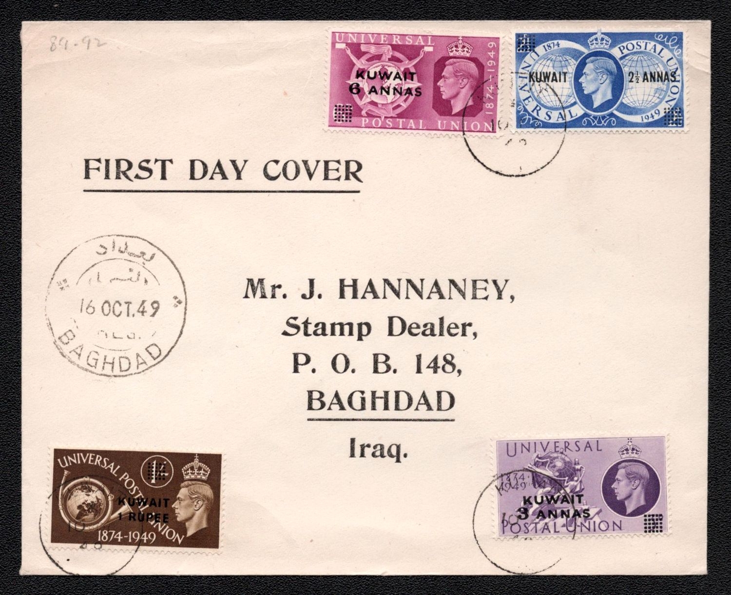 2118 image1949 16 (Oct) Kuwait, British Protectorate, First Day Registered Cover from Kuwait to Baghdad (Iraq), franked with Complete Set 2 1/2a on 2 1/2p - 1r on 1sh. | Michel 81-84 (Image 1) (Image 2)