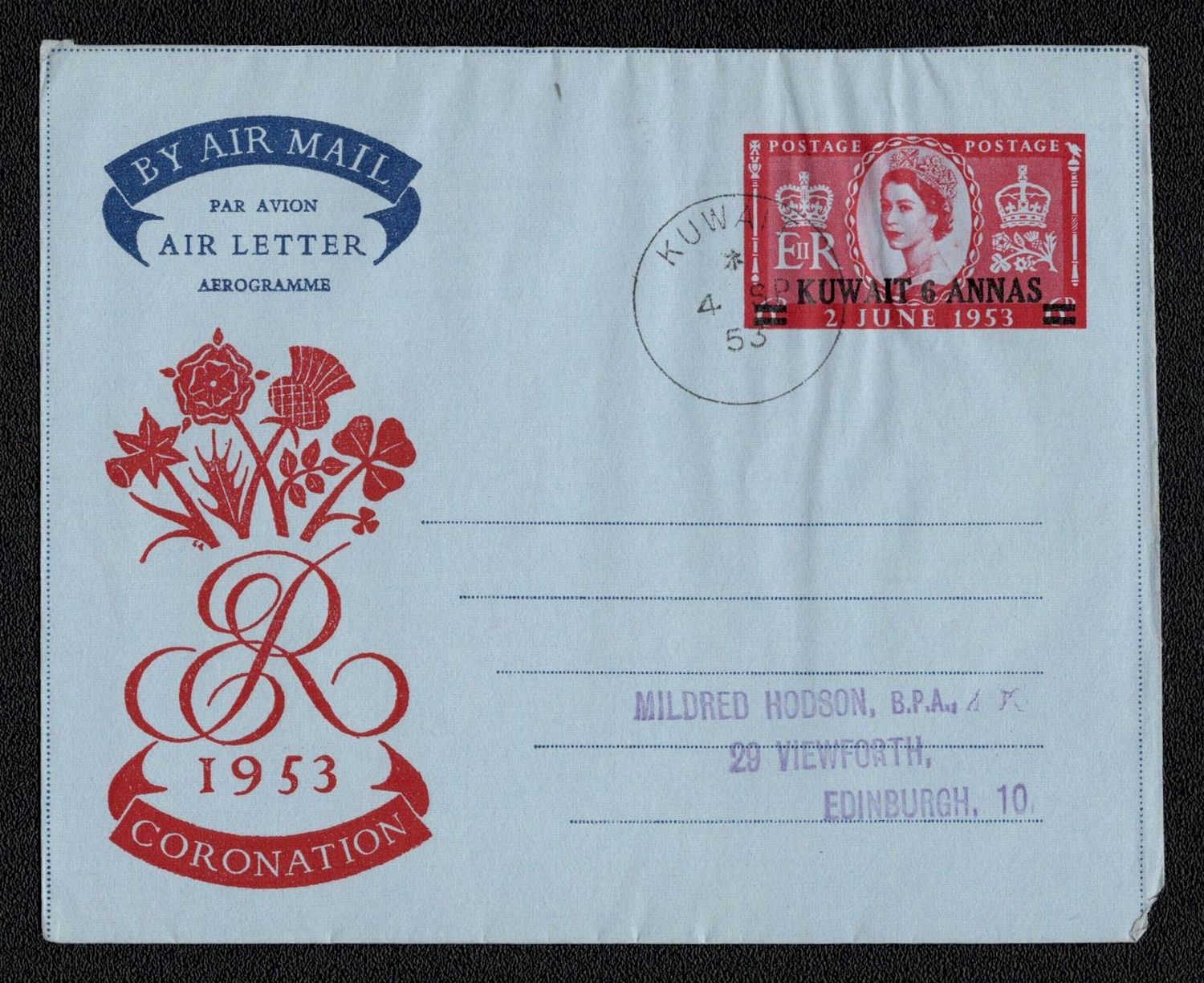 2122 image1953 4 (Sep) 6a on 6p Kuwait, British Protectorate, Air Letter, Postal Stationery Aerogram 'Coronation of Queen Elizabeth II' Cover from Kuwait to Edinburgh (Scotland). (Image 1) (Image 2)