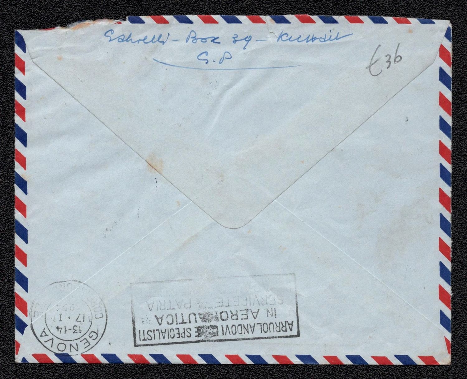 2123 image1954 17 (Jan) Kuwait, British Protectorate, Airmail Cover from Kuwait to Genoa (Italy), with handstamp 'Middle East Airlines', franked with four 1 1/2a on 1 1/2p. (Image 1) (Image 2)