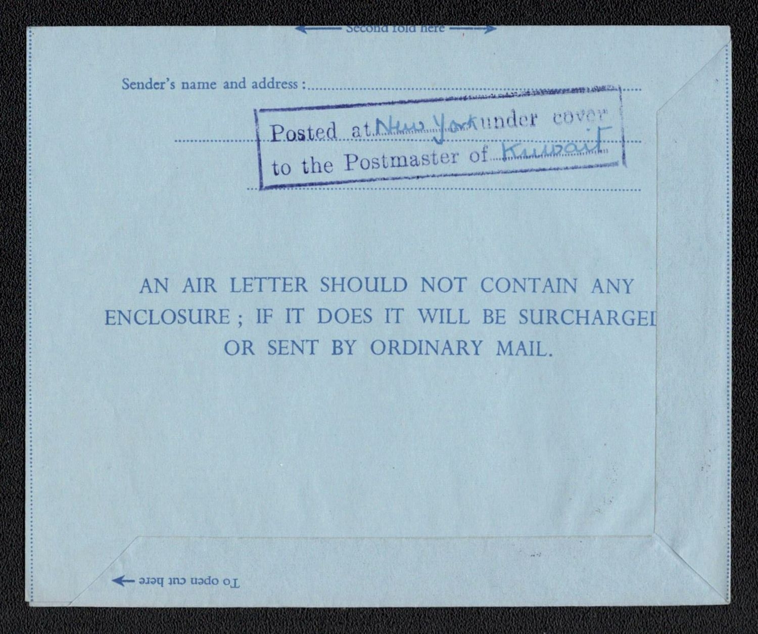 2128 image1957 3 (Nov) 6a on 6p Kuwait, British Protectorate, Air Letter, Postal Stationery Aerogram Cover from Kuwait to Grendon, Northamptonshire (England), with Violet Handstamp 'Posted at New York Under Сover to the Postmaster of Kuwait'. (Image 1) (Image 2)