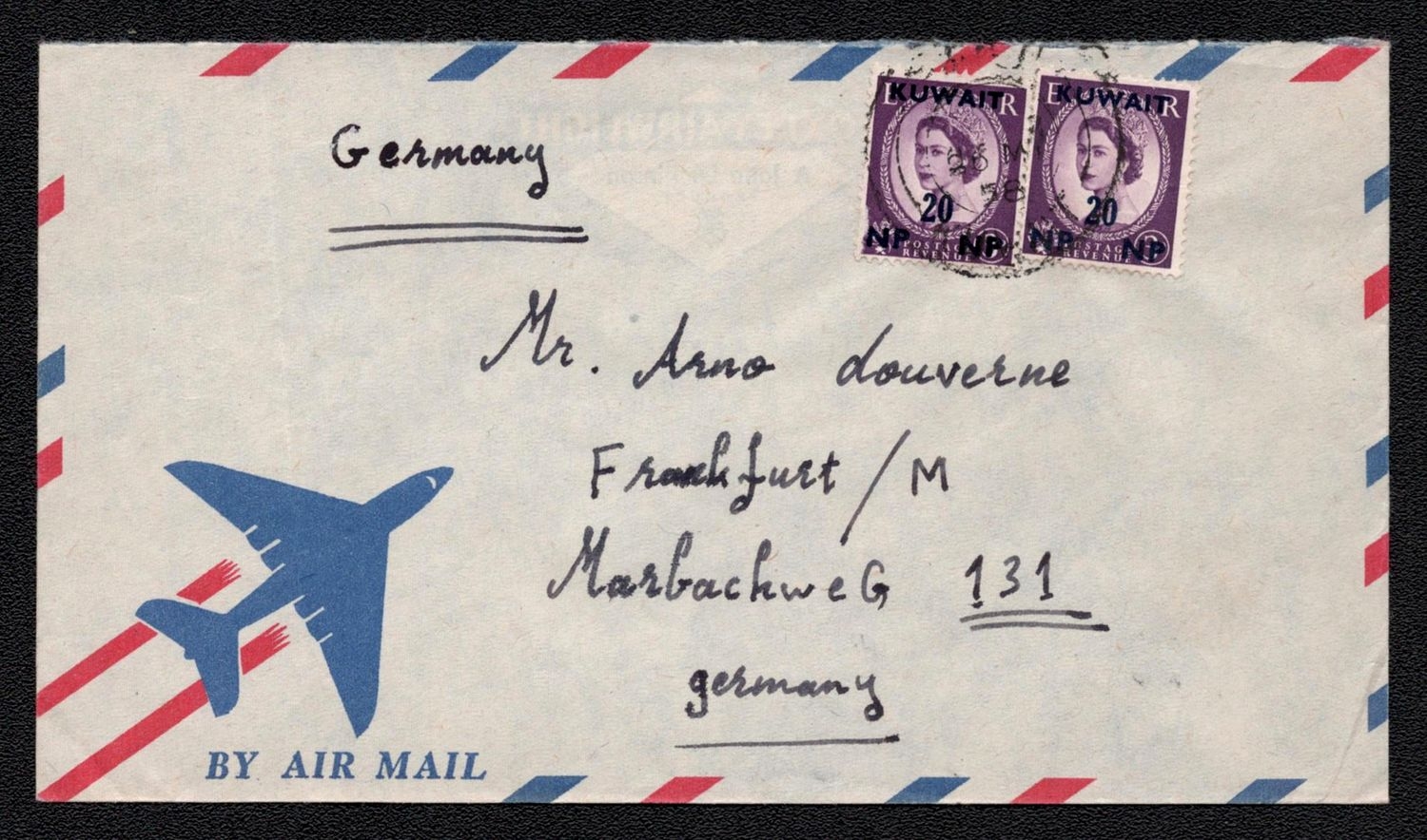 2129 image1958 26 (May) Kuwait, British Protectorate, Airmail Cover from Kuwait to Frankfurt (Germany), franked with two 20np on 3p. | Michel 125 (Image 1) (Image 2)