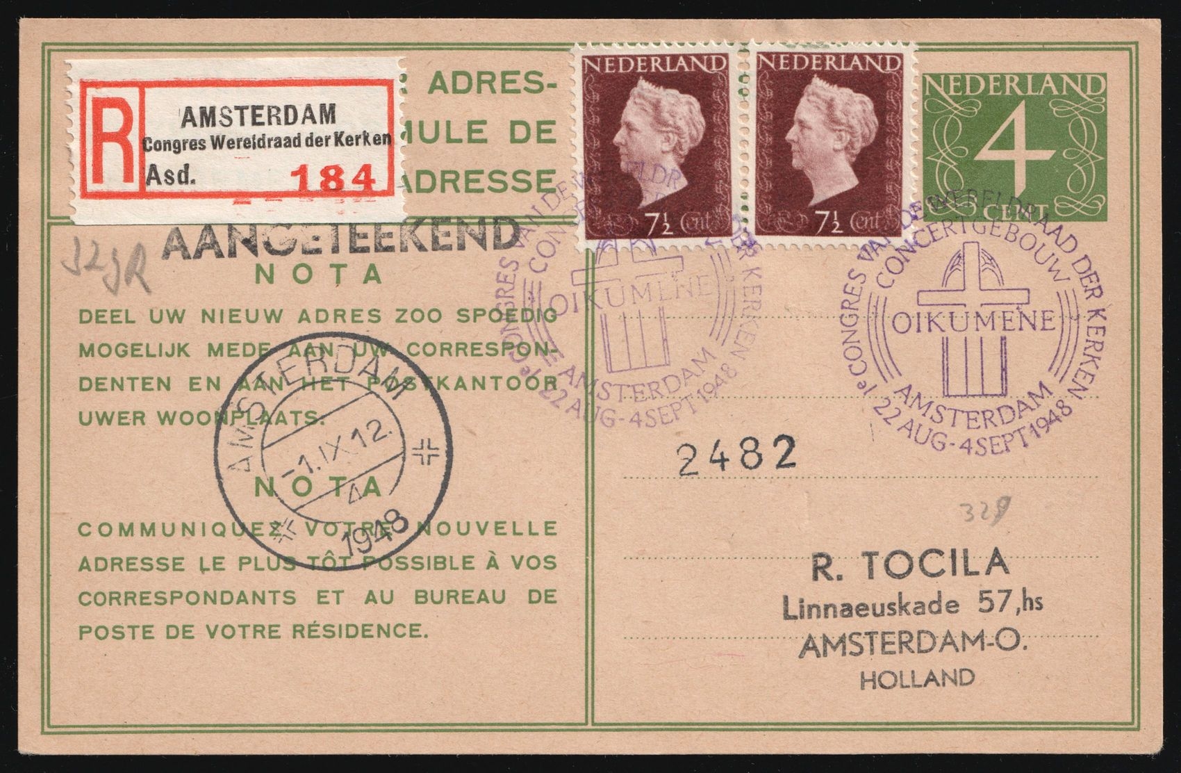 1948 (1 Sep) Netherlands, 'First Congress of the World Council of Churches', 'Notice of Change of Address', 4c