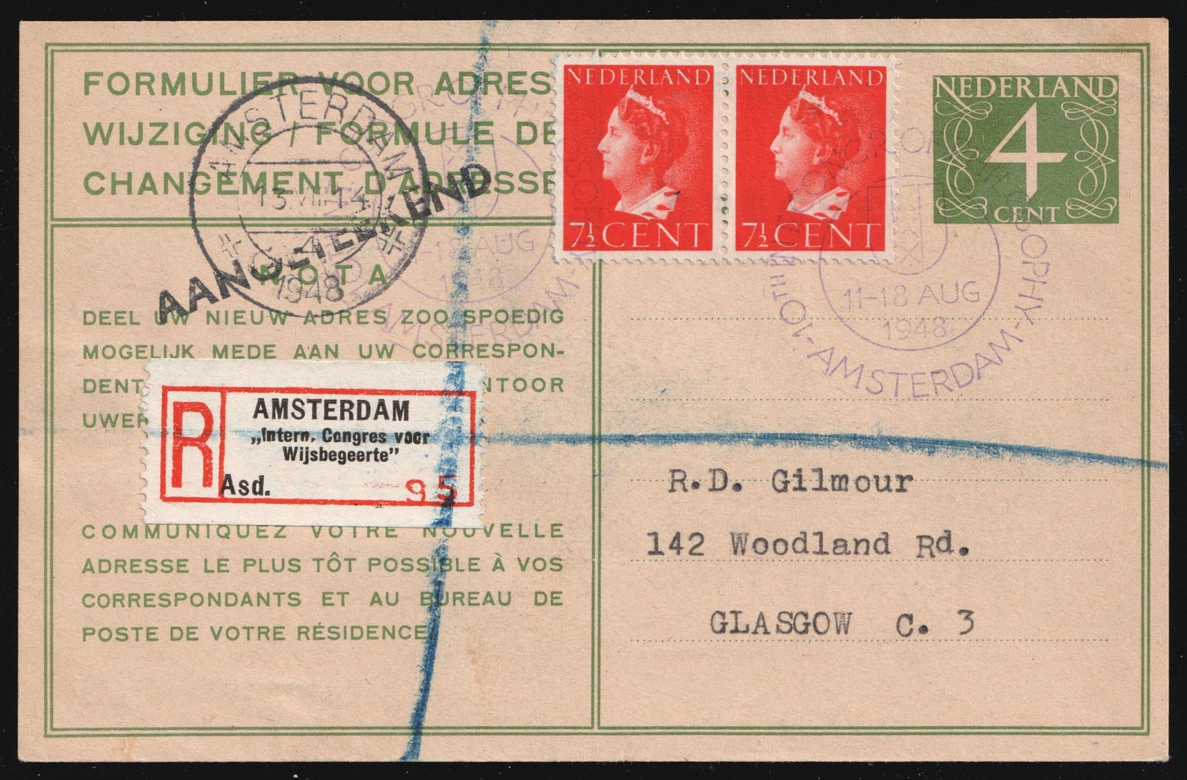 1948 (13 Aug) Netherlands, 'International Congress of Philosophy', 'Notice of Change of Address', 4c