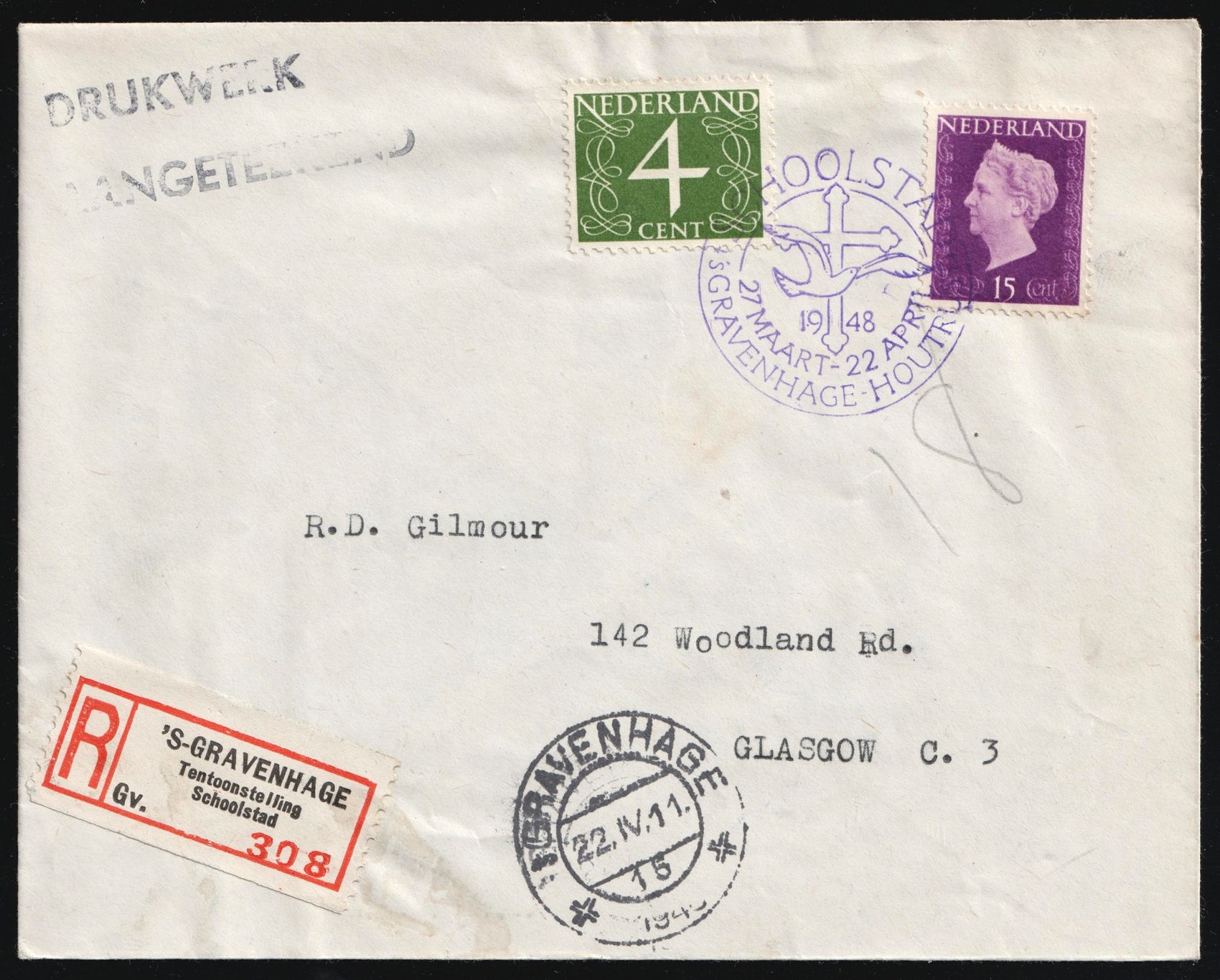 1948 (22 Apr) Netherlands, 'School City Exhibition', Registered Cover from Hague to Glasgow (Scotland) franked