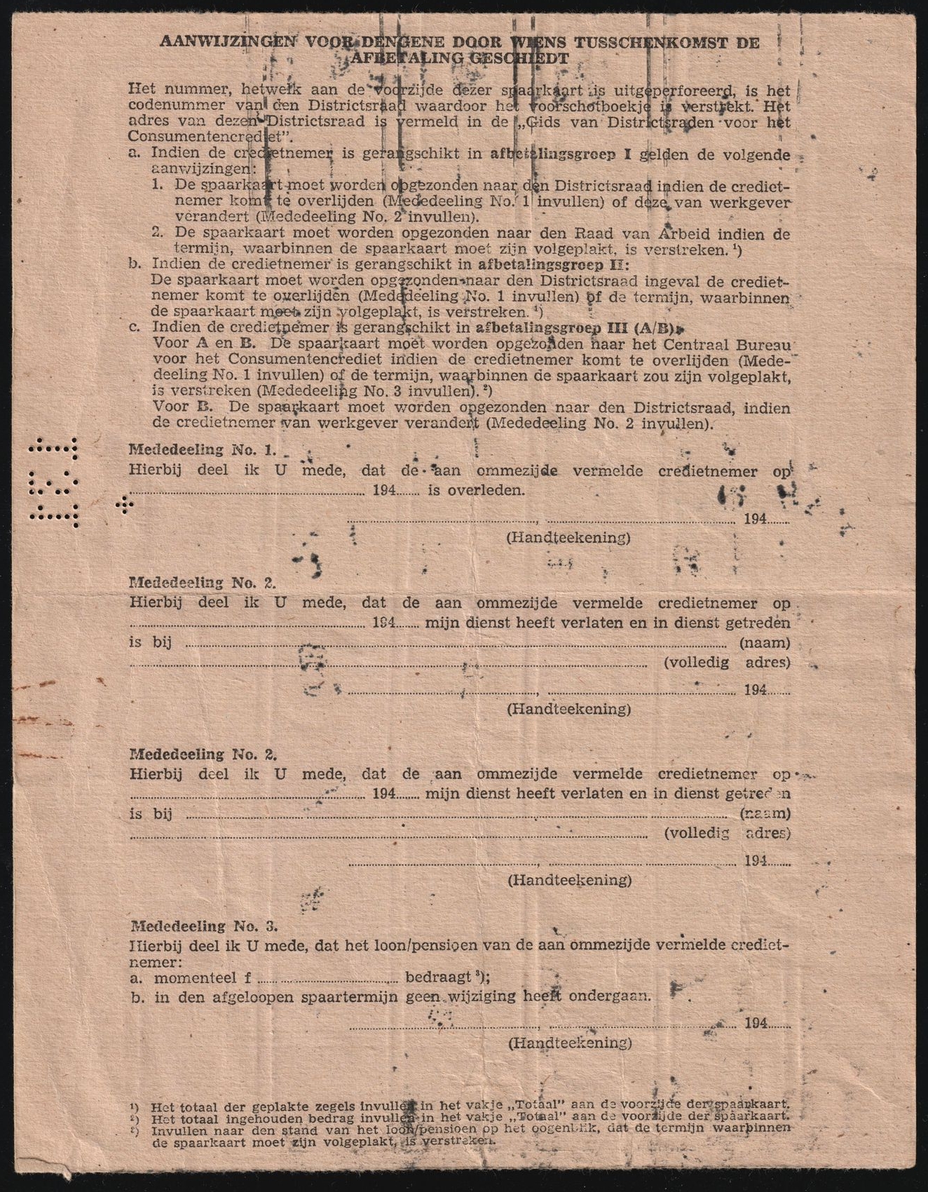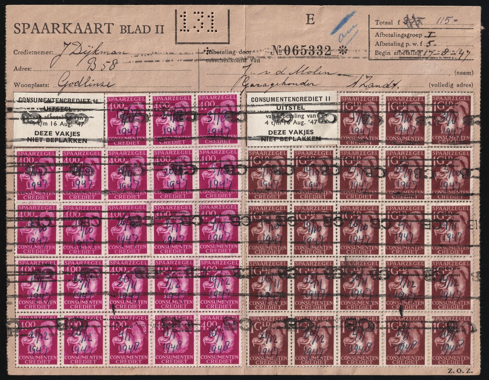 1947 (17 Aug) Netherlands, Consumer Credit Savings Card from Godlinze franked with blocks of Savings stamps.