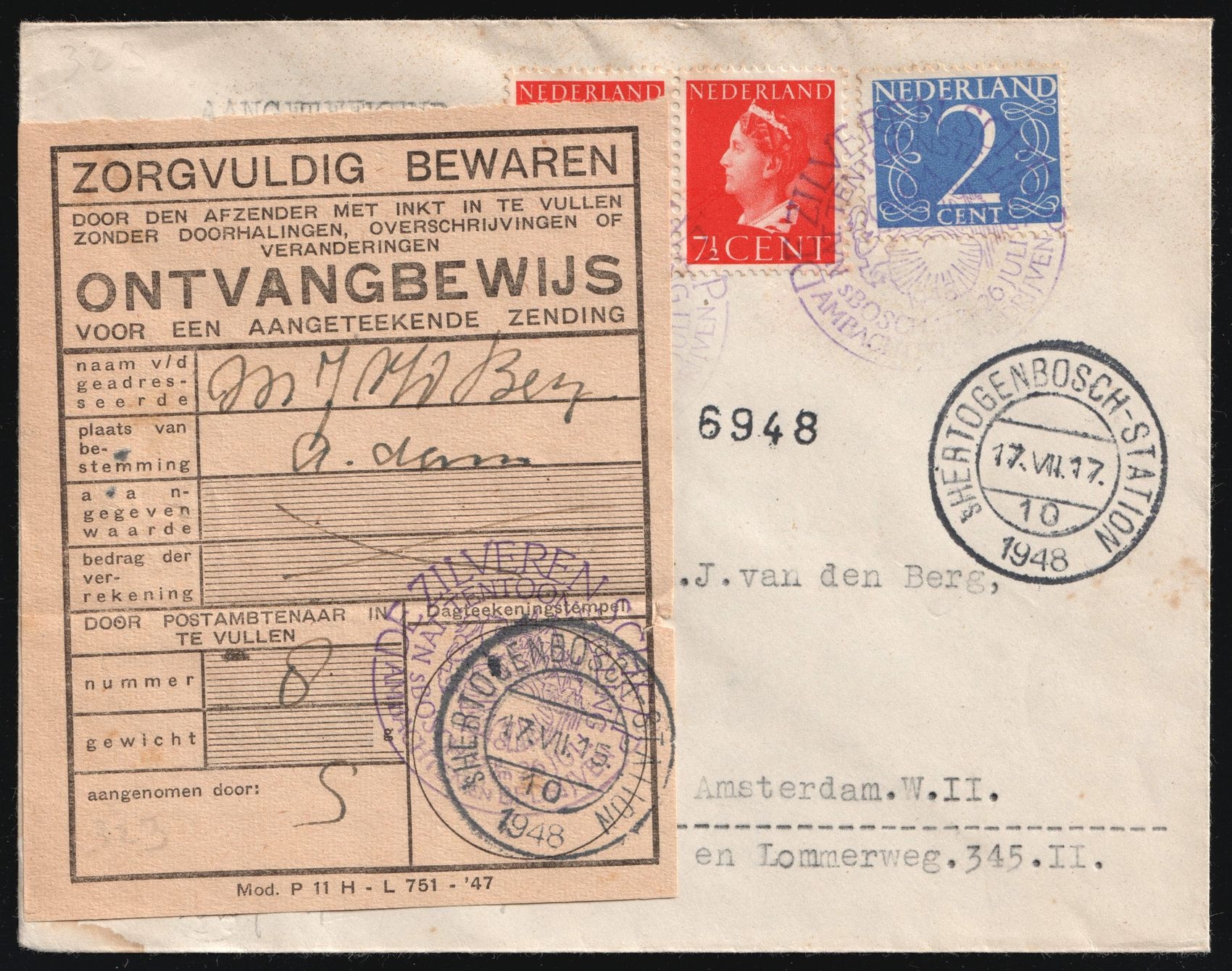 Amsterdam franked with pair of 7.5c and 2c with Receipt of Registered Mail, Commemorative Postmarks. | Michel 342, 469 (Image 1)