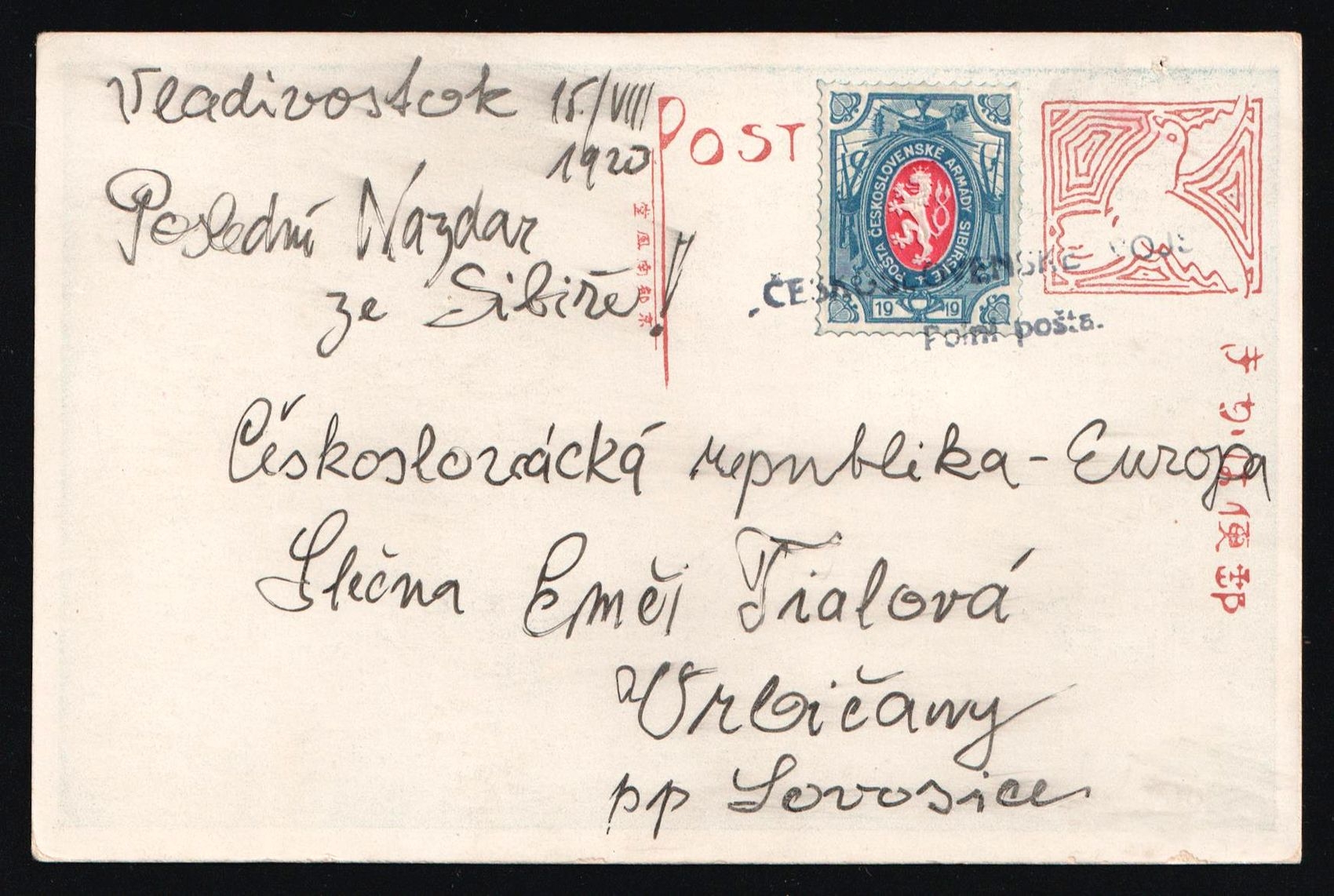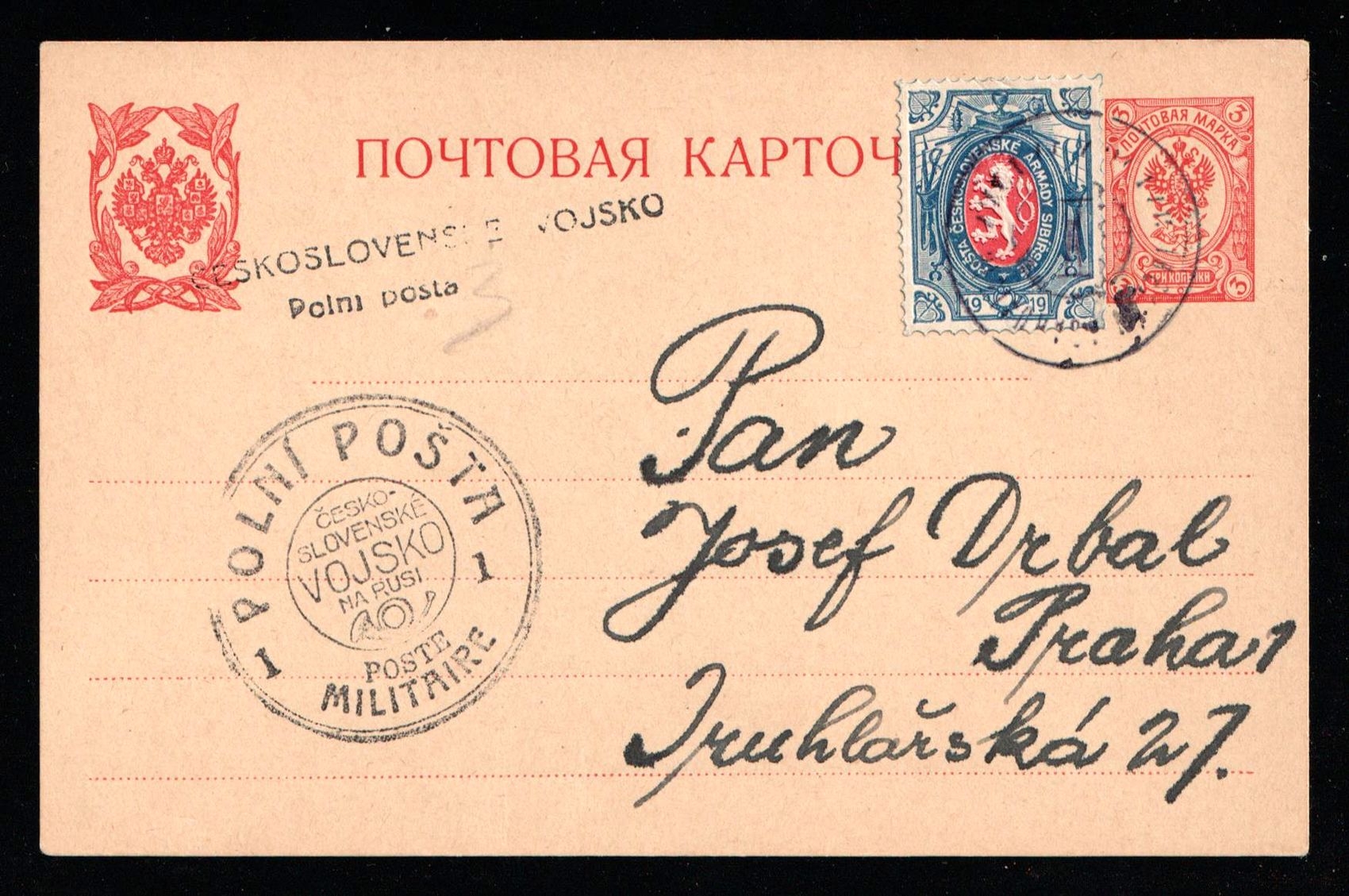 5685 image1919-20 Czechoslovak Legion in Siberia 3k postcard to Prague, additionally franked with 1r legion stamp tied by circular handstamp, Czechoslovak Legion postmarks alongside (Image 1) (Image 2)