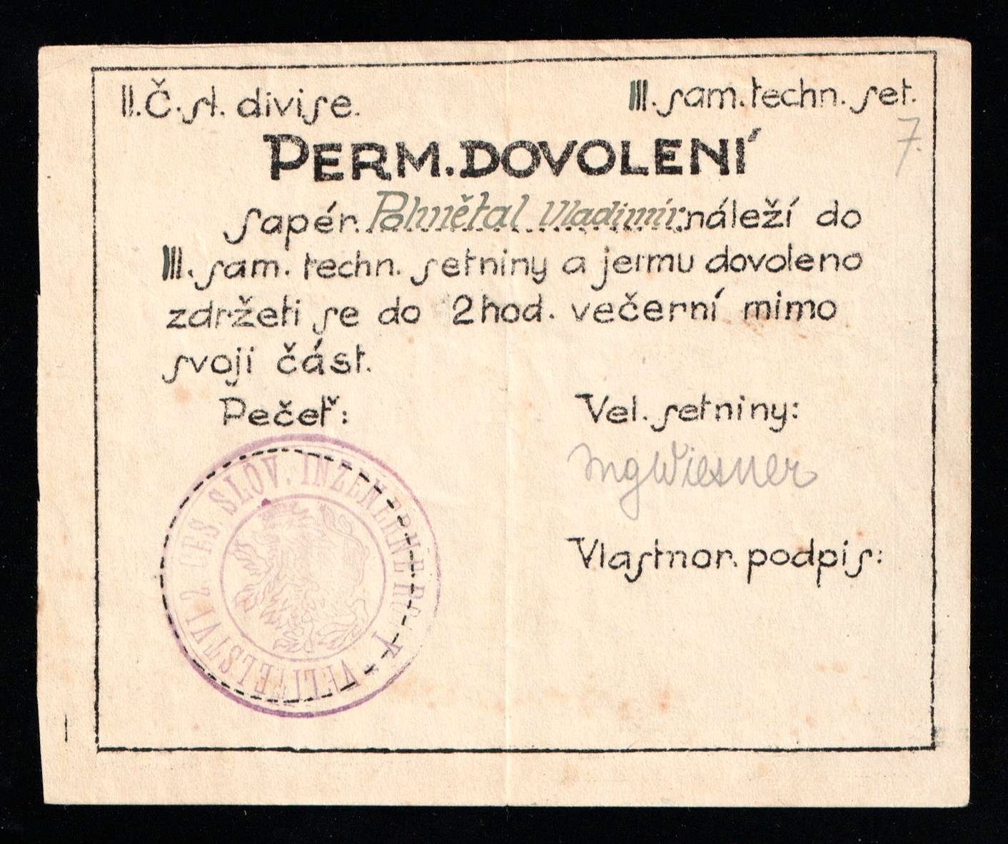 5695 image1919 Czechoslovak Legion in Siberia, Military Leave Permit Card (Perm. Dovolení) 11th Division Sapper WWI Era (Image 1)