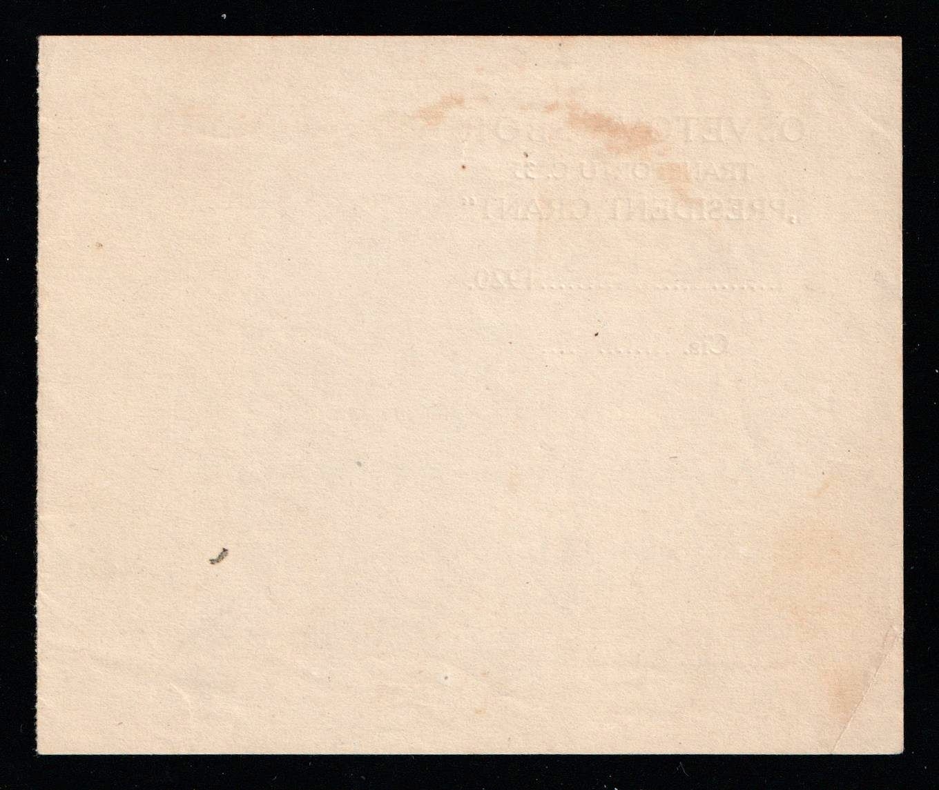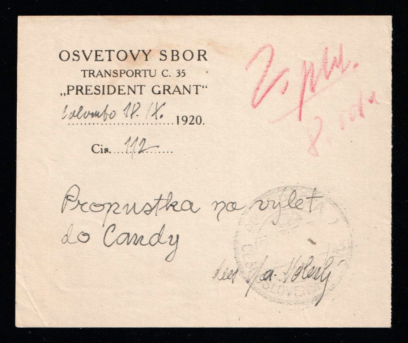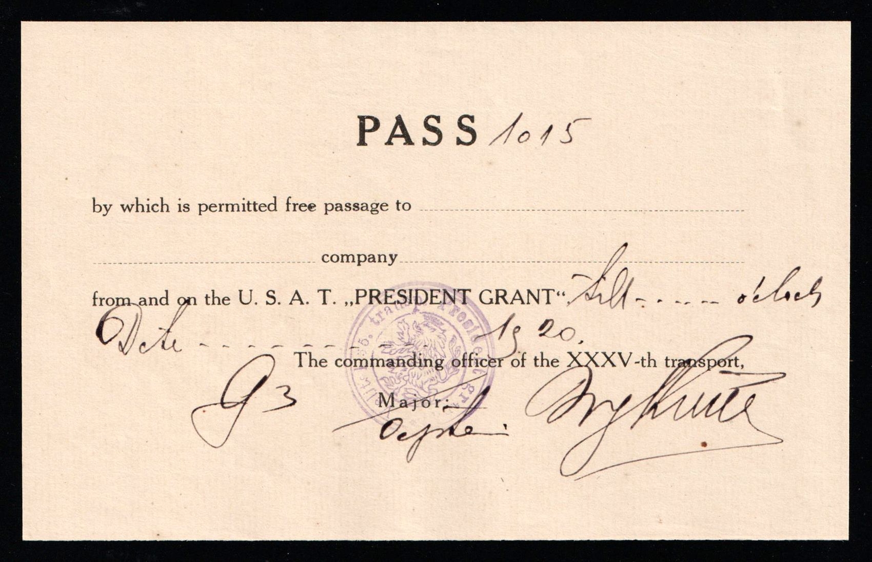 5696 image1920 Czechoslovak Legion in Siberia, Transport Card 'President Grant' ship – Siberia to Canada, Rare Military Document. The USS President Grant was authorized to return home the Czech legions fighting in Siberia. In 1920 it was used to transport the Czech troops from Vladivostok to Trieste. This is an actual pass for that trip aboard the USS Grant. Signed by the commanding officer and with the Czech lion handstamp "5. Transp. President Grant' (Image 1) (Image 2)