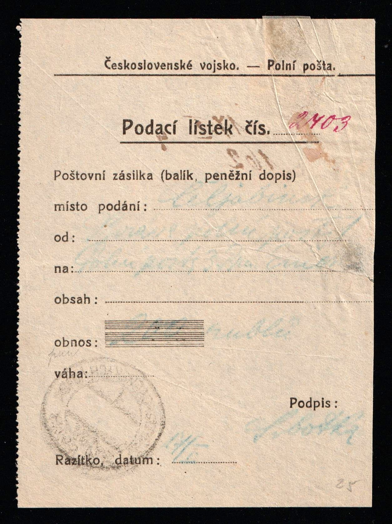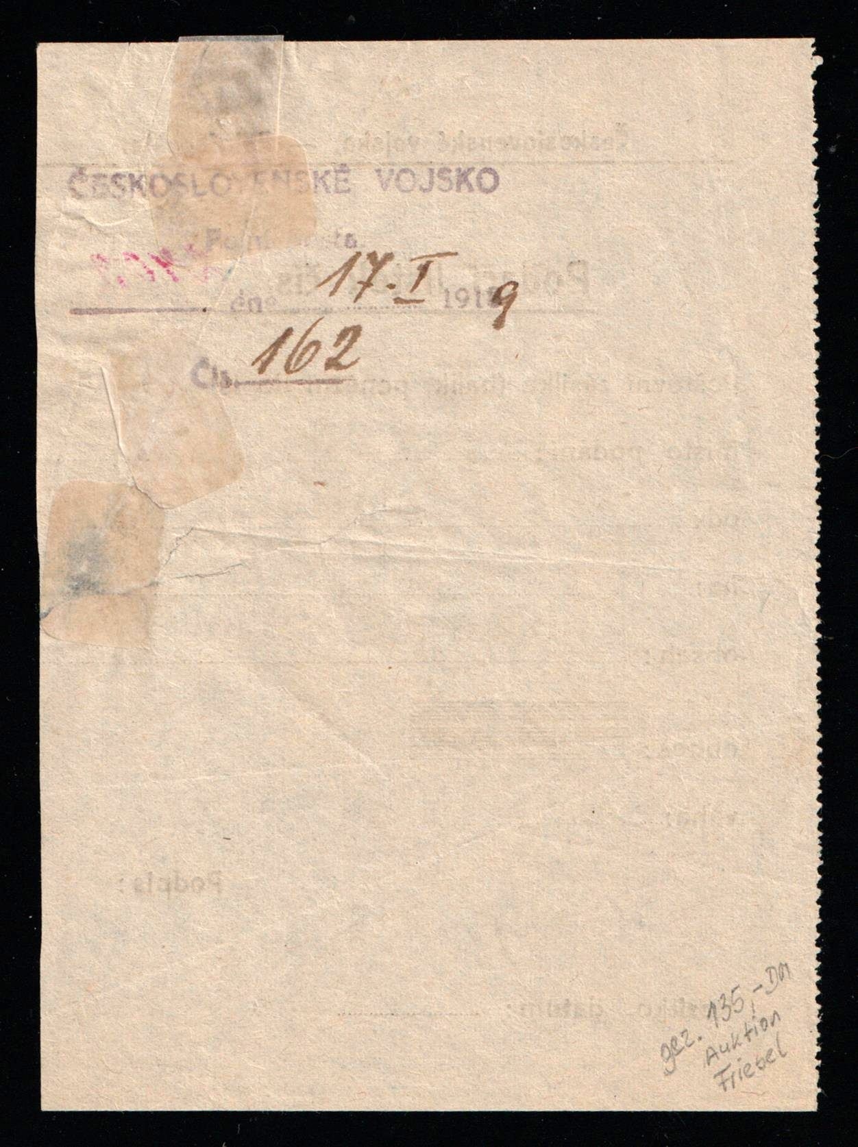 5697 imageCzechoslovak Army Field Post Receipt “Podací Lístek” – Military Mail Form, Legion Era c.1918–1920, Czech Field Post Document with Stamp, Vintage WWI Militaria Ephemera (Image 1) (Image 2)
