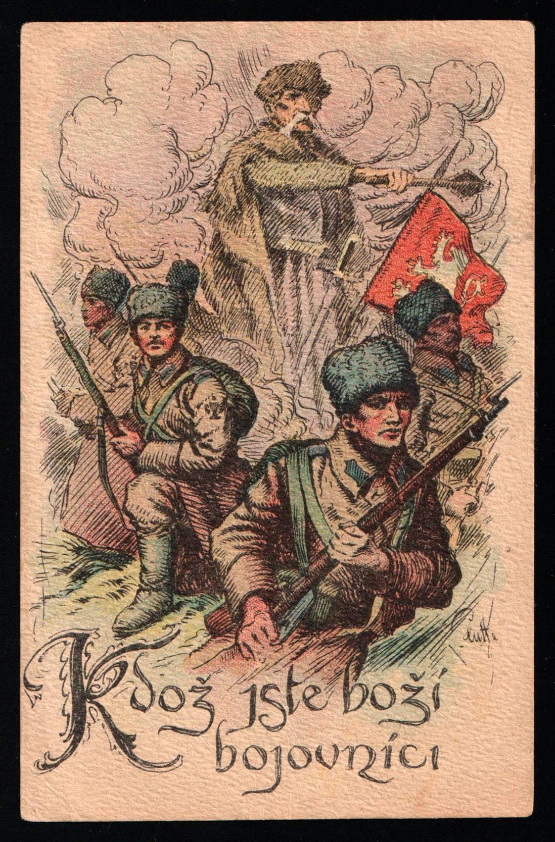 5700 imageWWI Czechoslovak Legion Patriotic Postcard “Kdož jste boží bojovníci” – Armed Soldiers with Flag, 1910s Military Propaganda Card, Posted with Stamp, Rare Czech Militaria (Image 1) (Image 2)