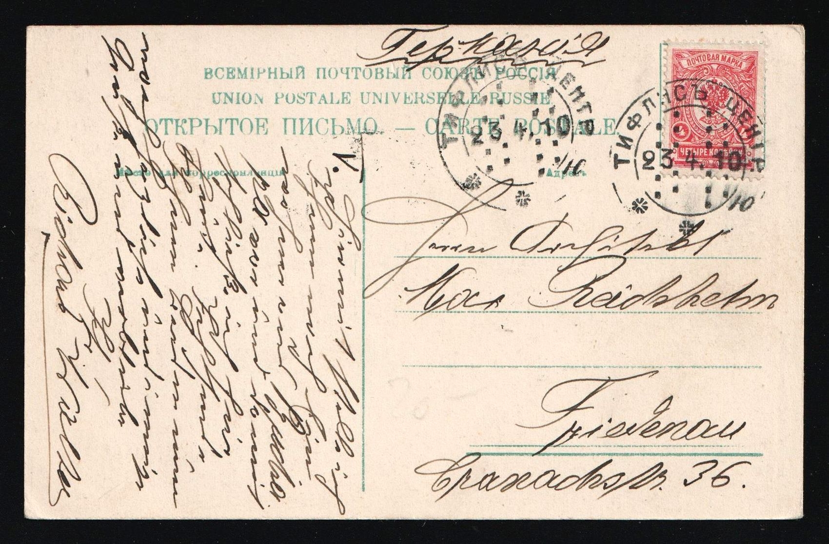 Tiflis Central City Post Office instead of registration label and international registration mark of “R”. Transit postmark of Moscow and arrival in Berlin. (Image 1)