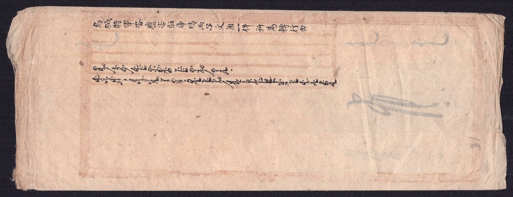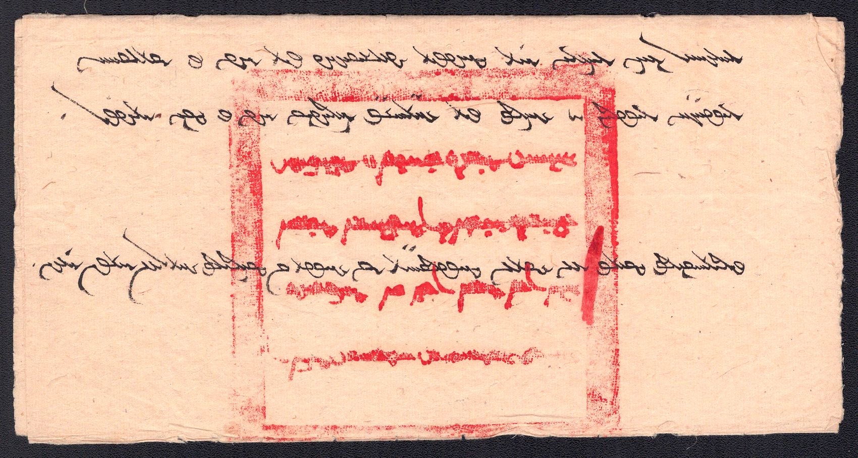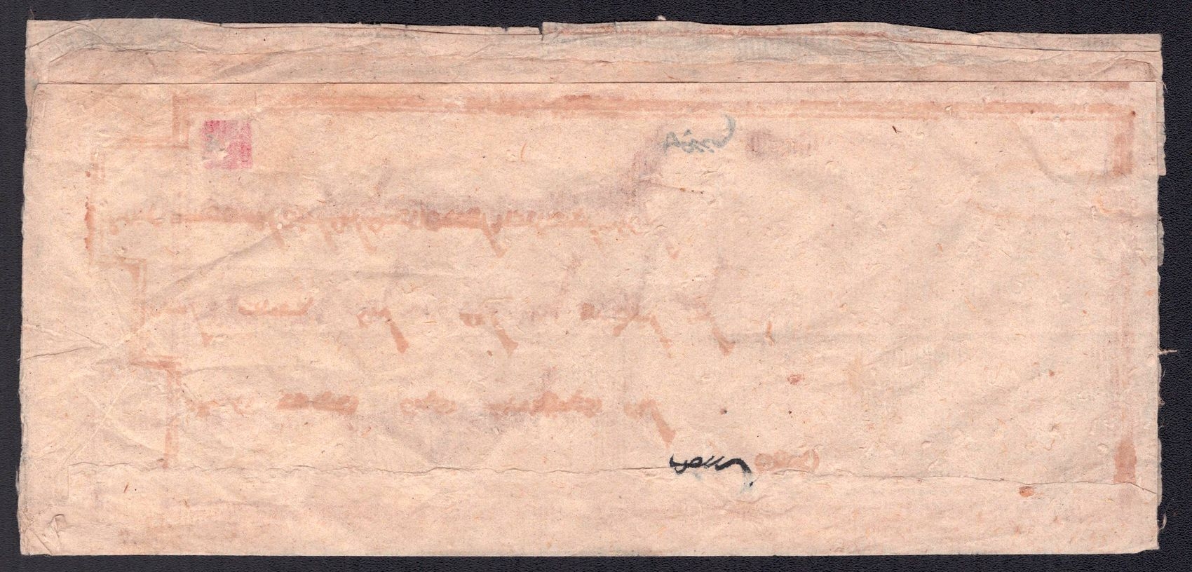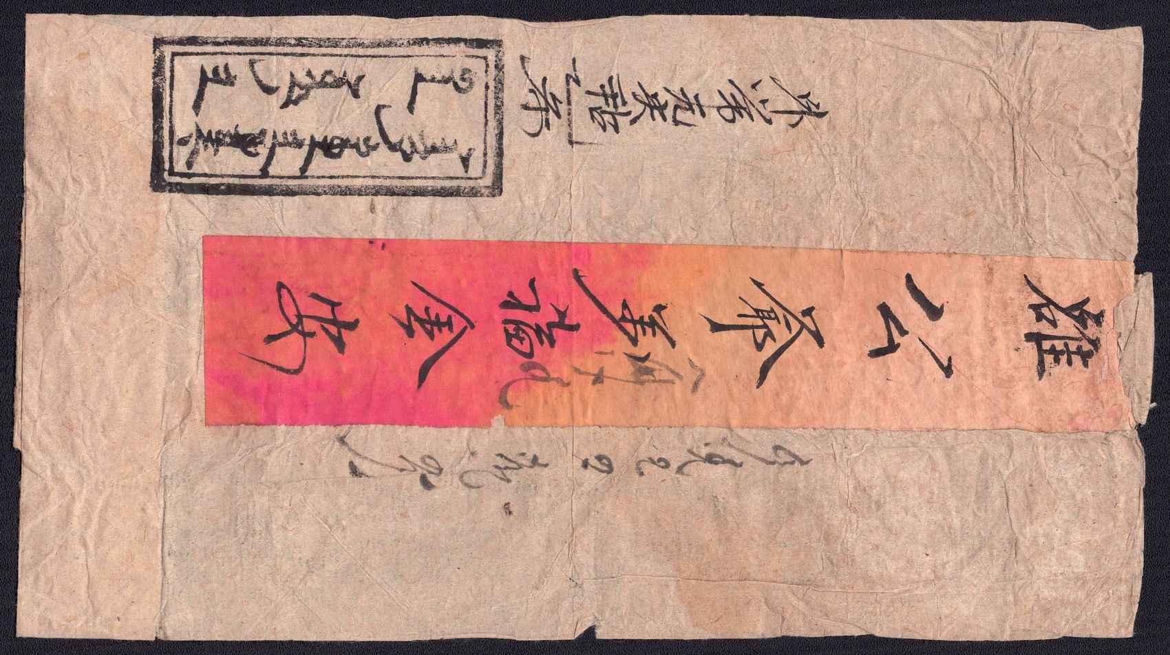 977 image1890-1920 Mongolia, Chinese Government Mail, Military Courier, An Uliyasutai folded wrapper sent from ex military chief to the small village of Kamayner. It was hand-carried and delivered ca. 1890's. It is addressed in both Chinese and Mongul (Image 1) (Image 2) (Image 3)