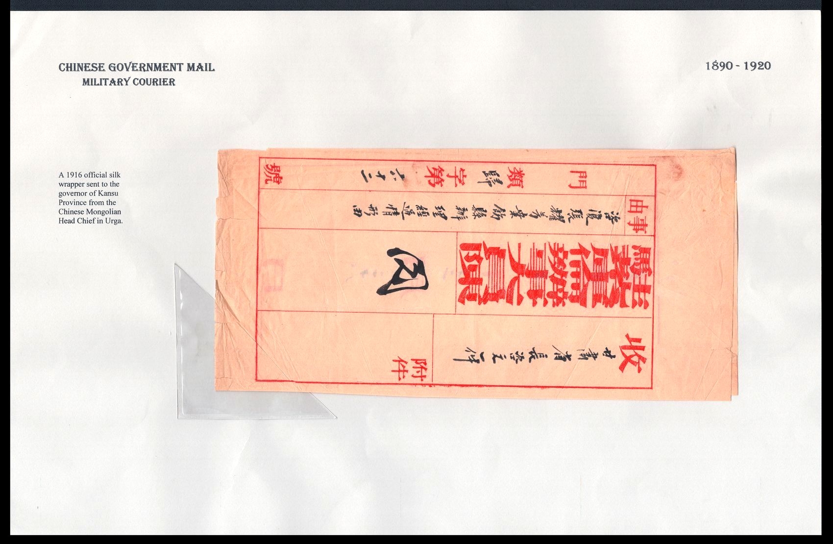 978 image1916 Mongolia, Chinese Government Mail, Military Courier, Official silk wrapper sent to the governor of Kansu Province from the Chinese Mongolian Head Chief in Urga (Image 1) (Image 2) (Image 3)