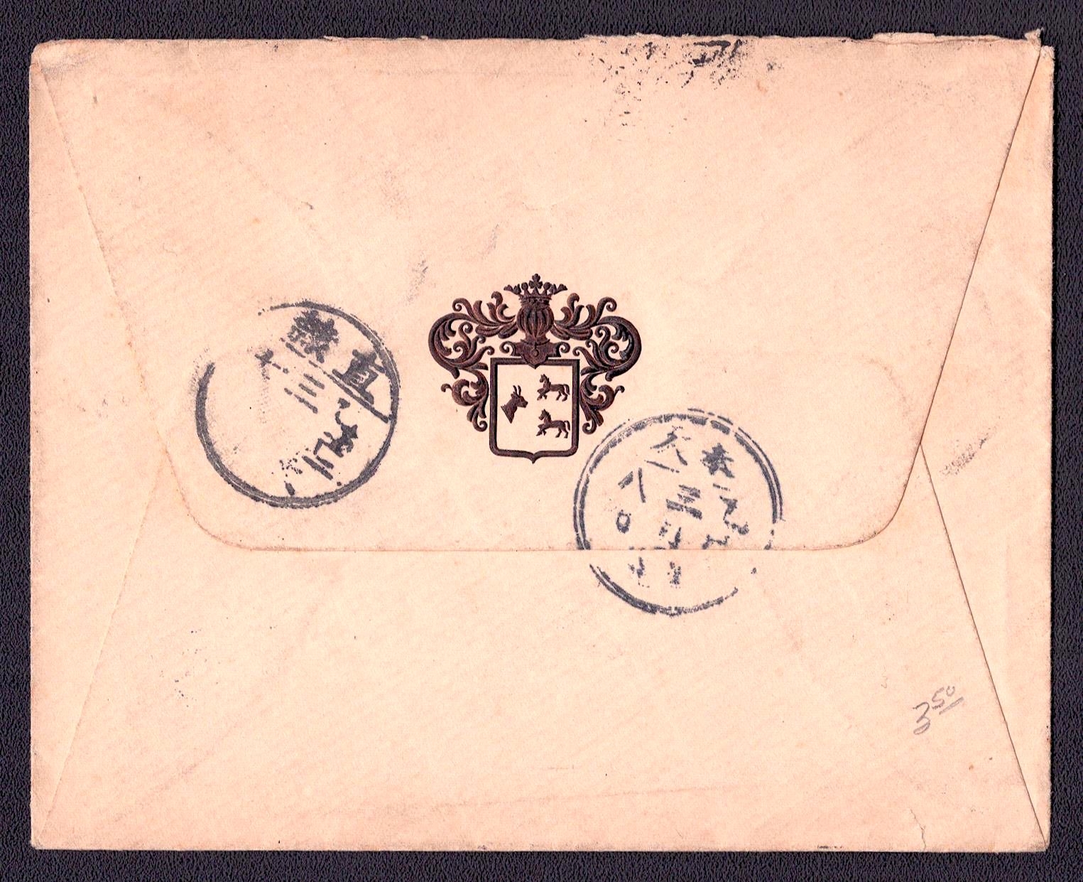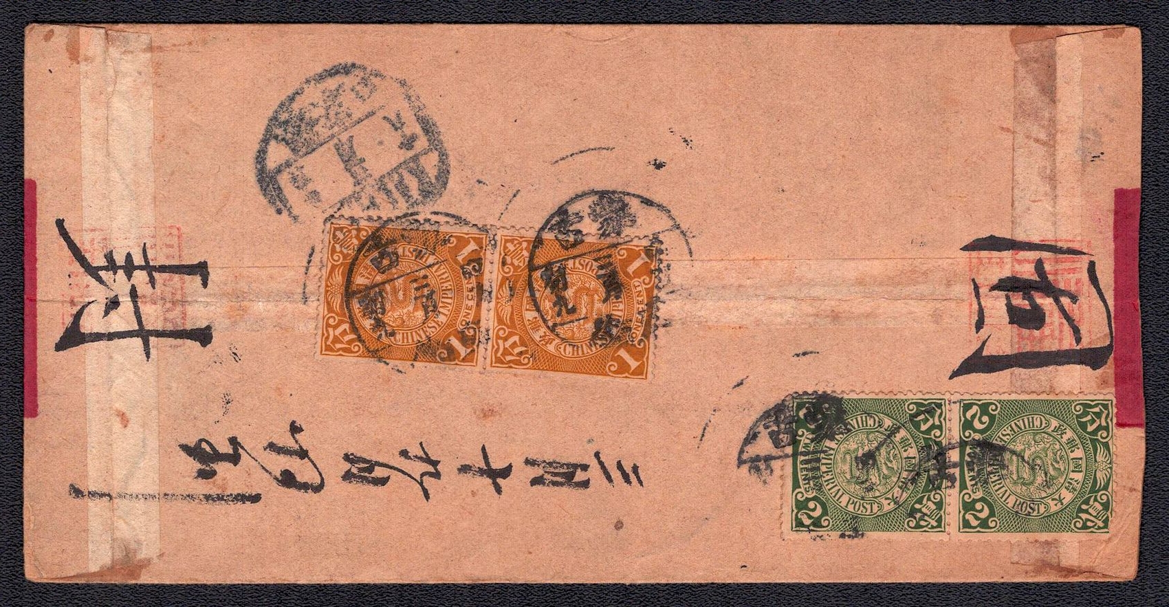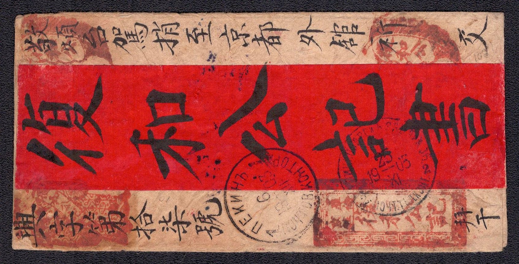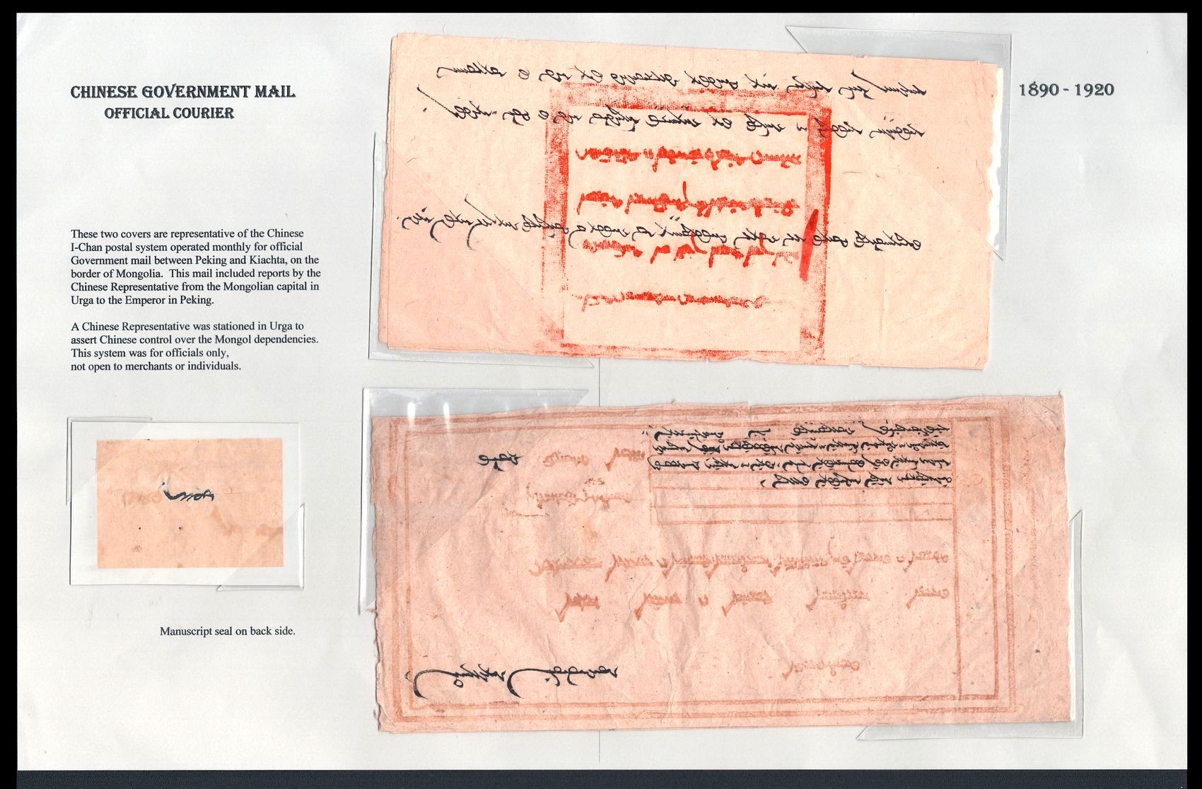 979 image1890-1920 Mongolia, Chinese Government Mail, Military Courier, Two covers are representative of the Chinese I-Chan postal system, which operated monthly for official government mail between Peking and Kiachta, on the border of Mongolia, Manuscript seal on back side (Image 1) (Image 2) (Image 3) (Image 4) (Image 5)