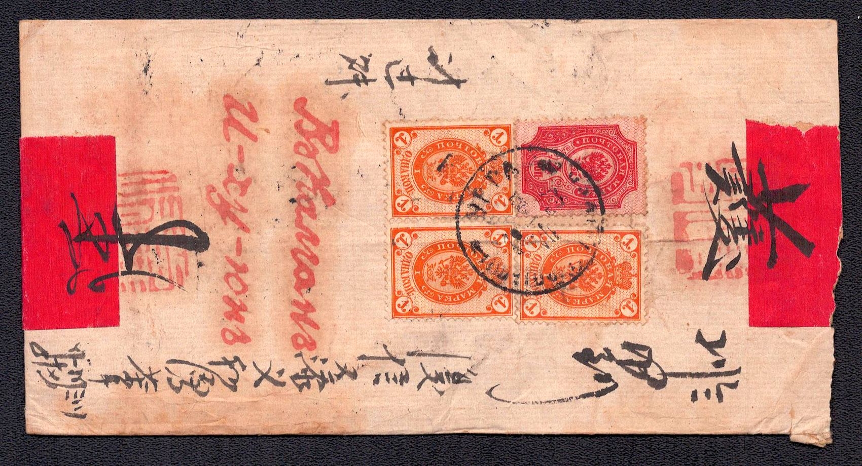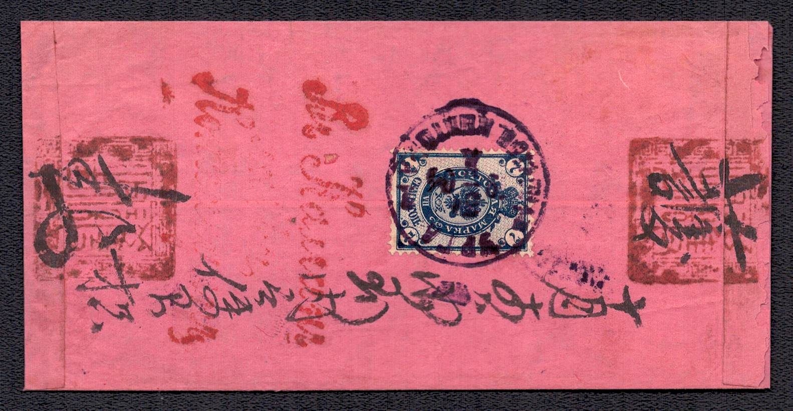 986 Used image1903 Red band cover franked on reverse with Russia 1889-92 3k pair & single tied by URGA Type 4 datestamp. Used, (Image 1) (Image 2)