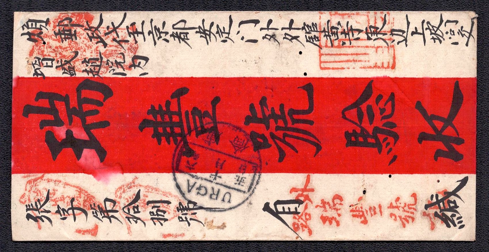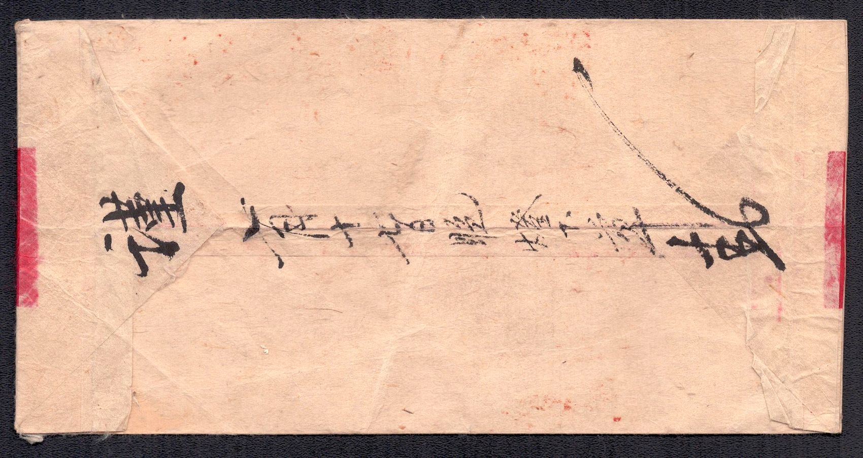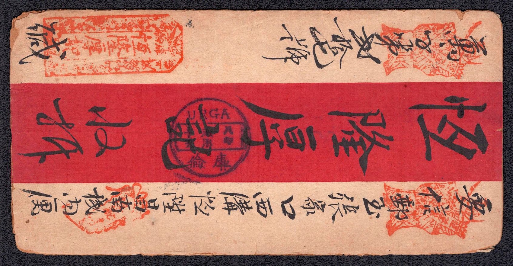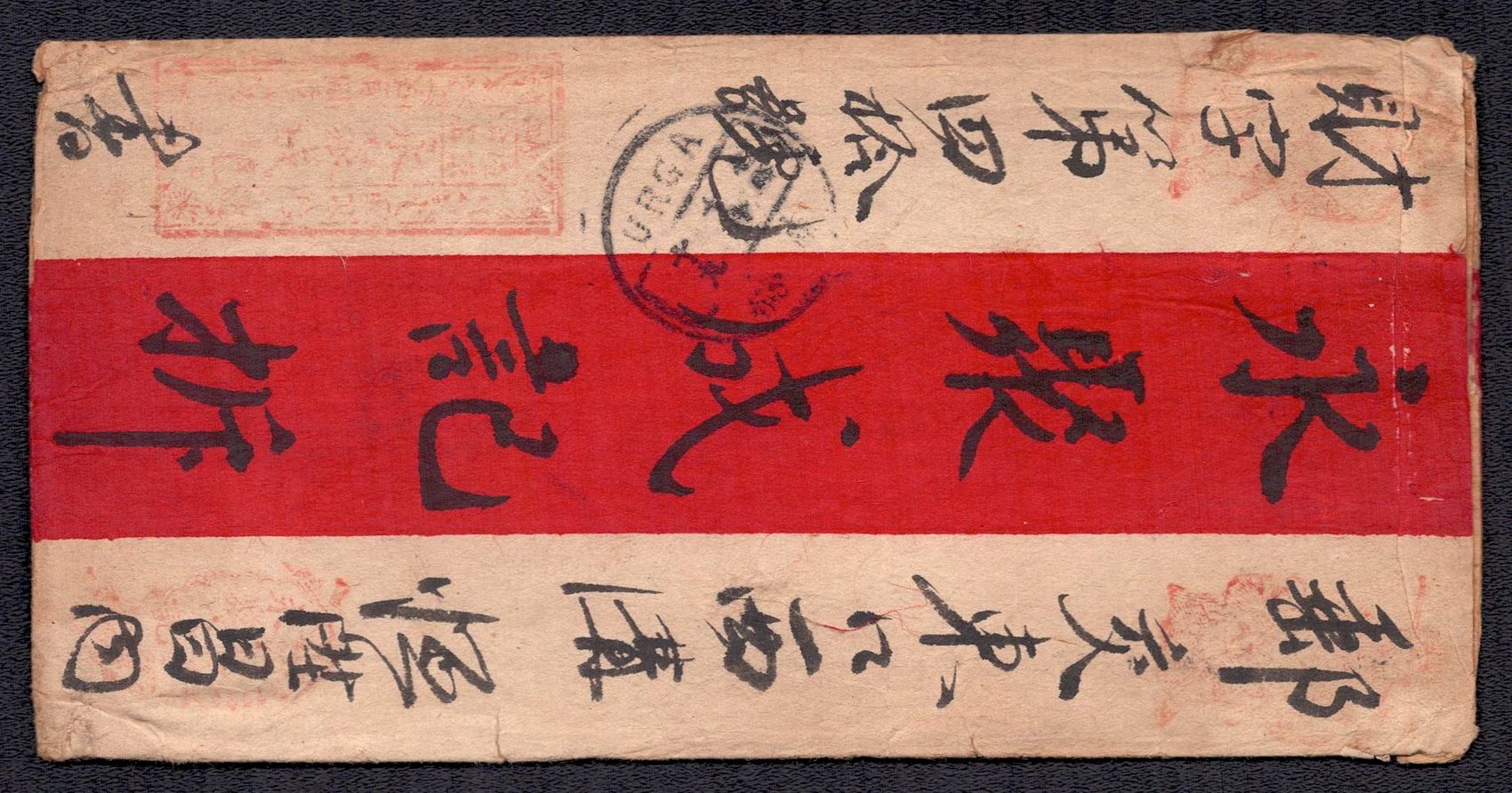 968 image1895 Ulyasutai Red Band cover that was privately carried and sent intemally to Urga. It is written and addressed in Chinese. It is stampless due to the fact that it did not go through the postal system at the time. Typical of the times, this cover utilizes native made paper instead of Ernopean woven type (Image 1) (Image 2)