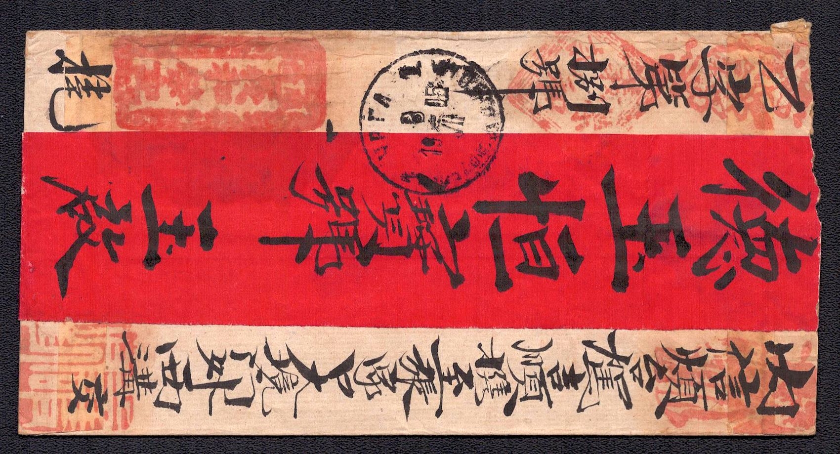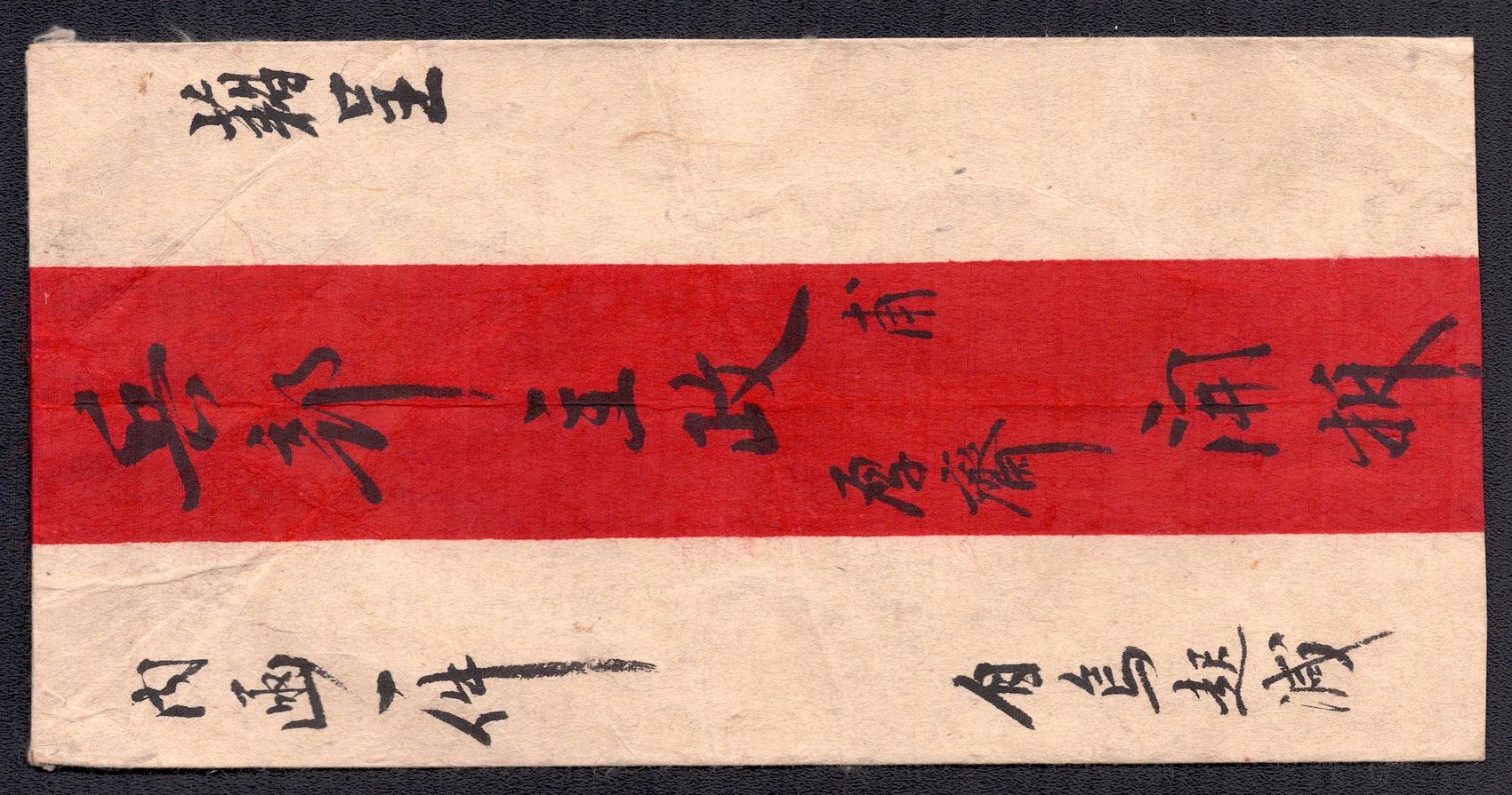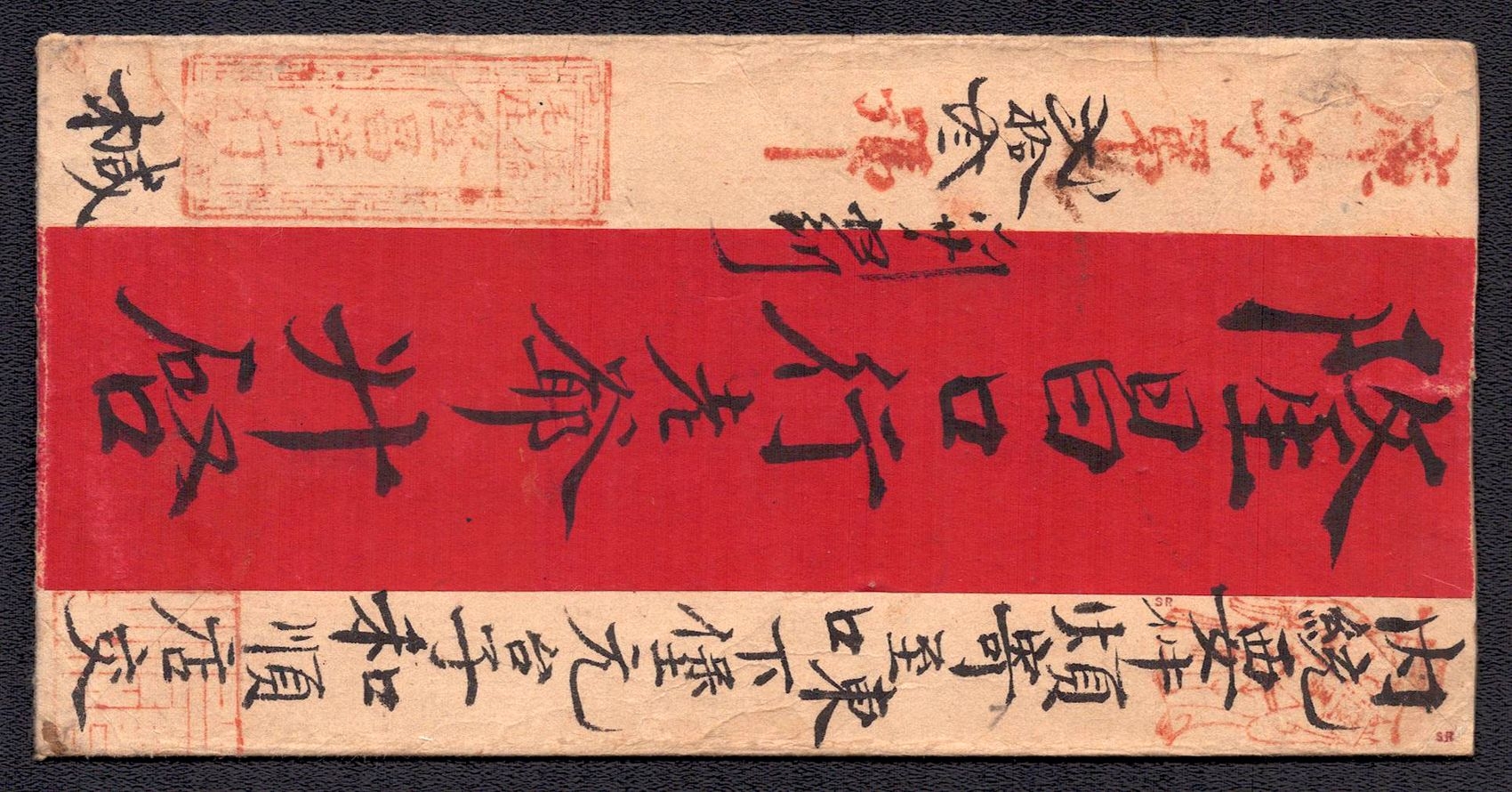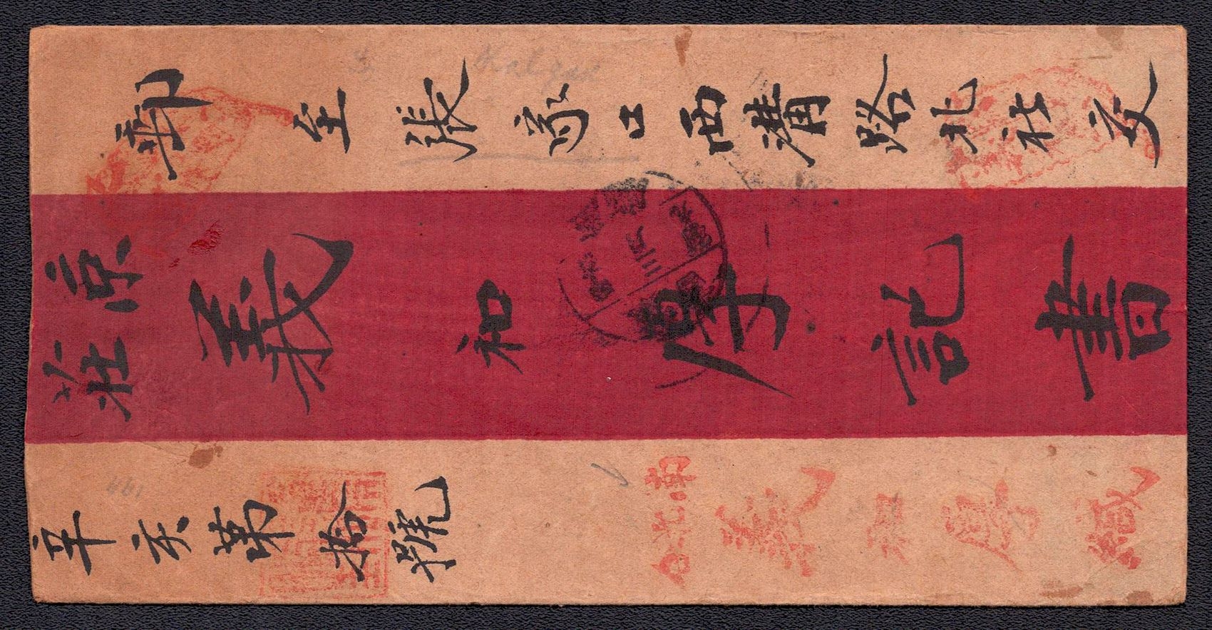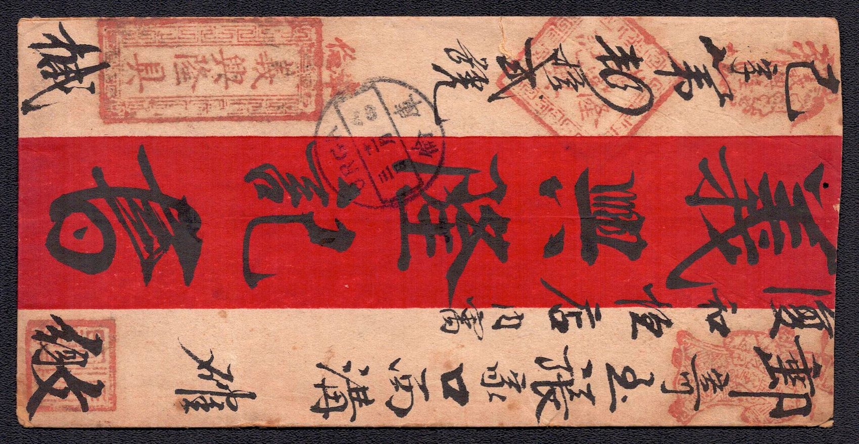 968 image1895 Ulyasutai Red Band cover that was privately carried and sent intemally to Urga. It is written and addressed in Chinese. It is stampless due to the fact that it did not go through the postal system at the time. Typical of the times, this cover utilizes native made paper instead of Ernopean woven type (Image 1) (Image 2)