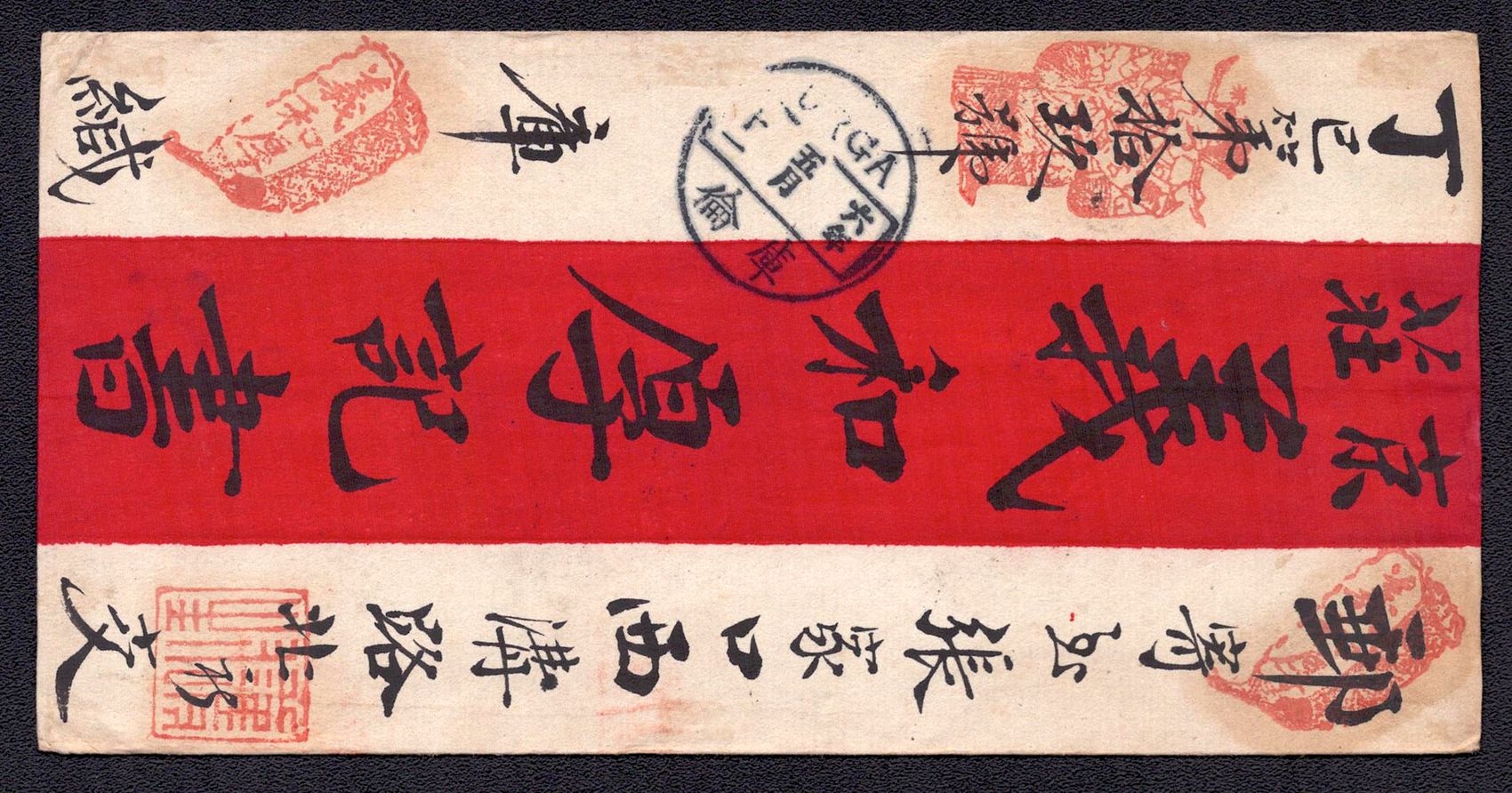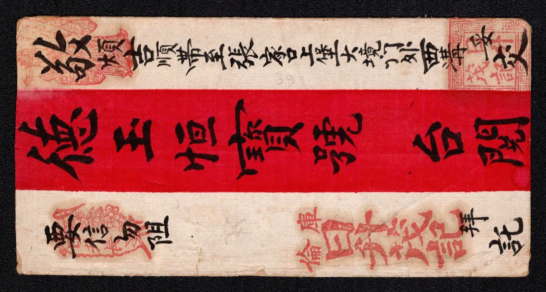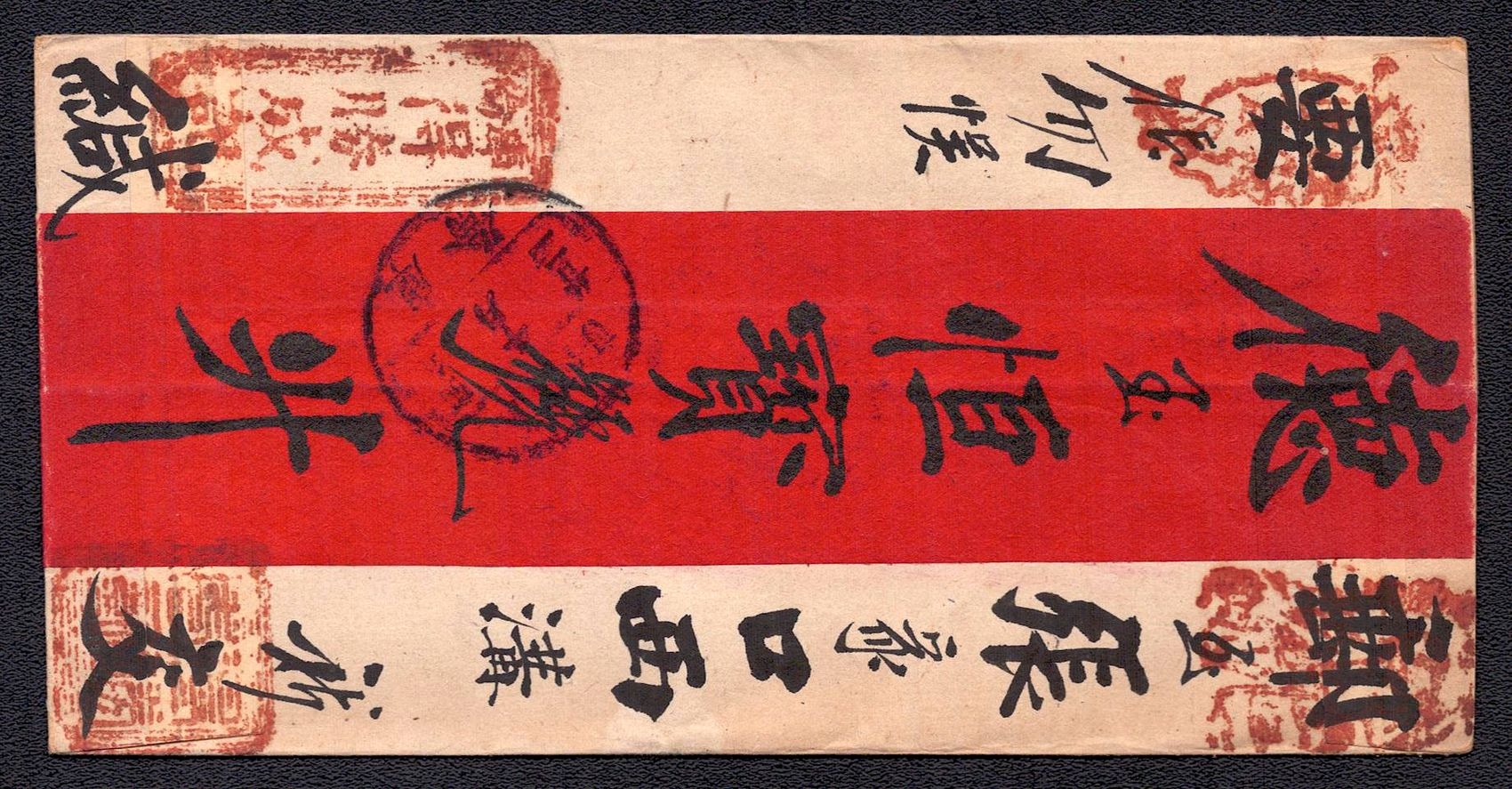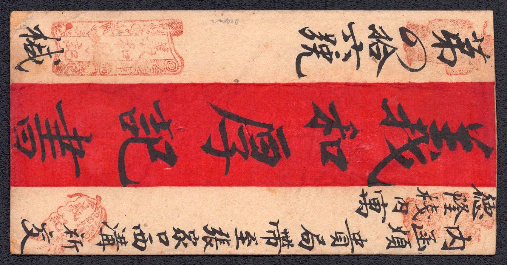 968 image1895 Ulyasutai Red Band cover that was privately carried and sent intemally to Urga. It is written and addressed in Chinese. It is stampless due to the fact that it did not go through the postal system at the time. Typical of the times, this cover utilizes native made paper instead of Ernopean woven type (Image 1) (Image 2)