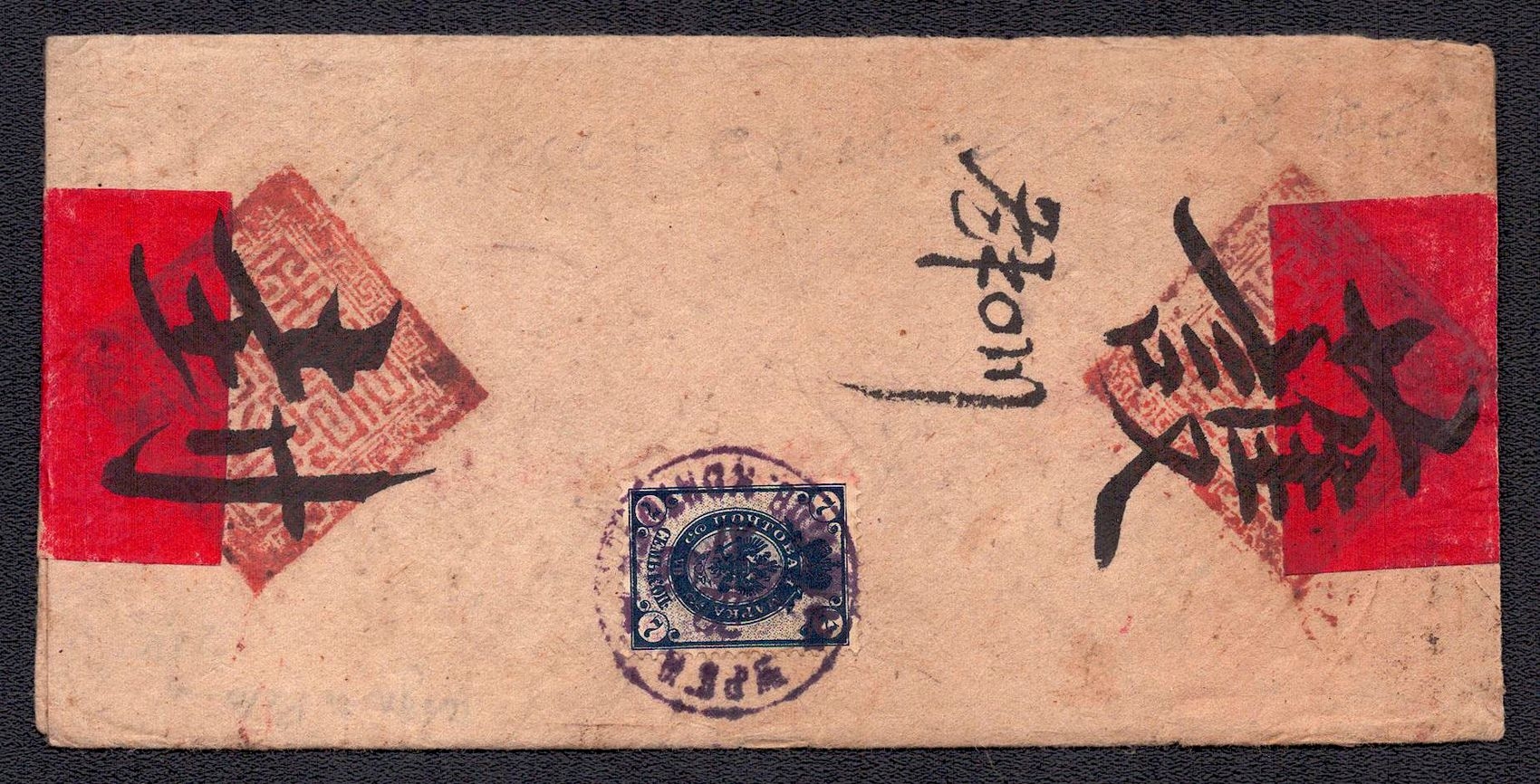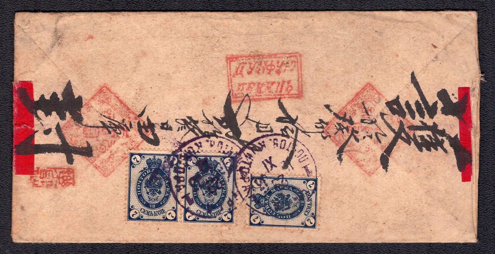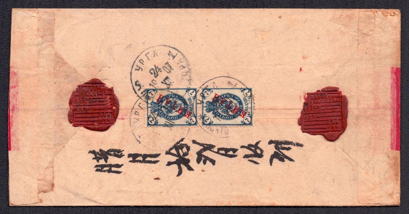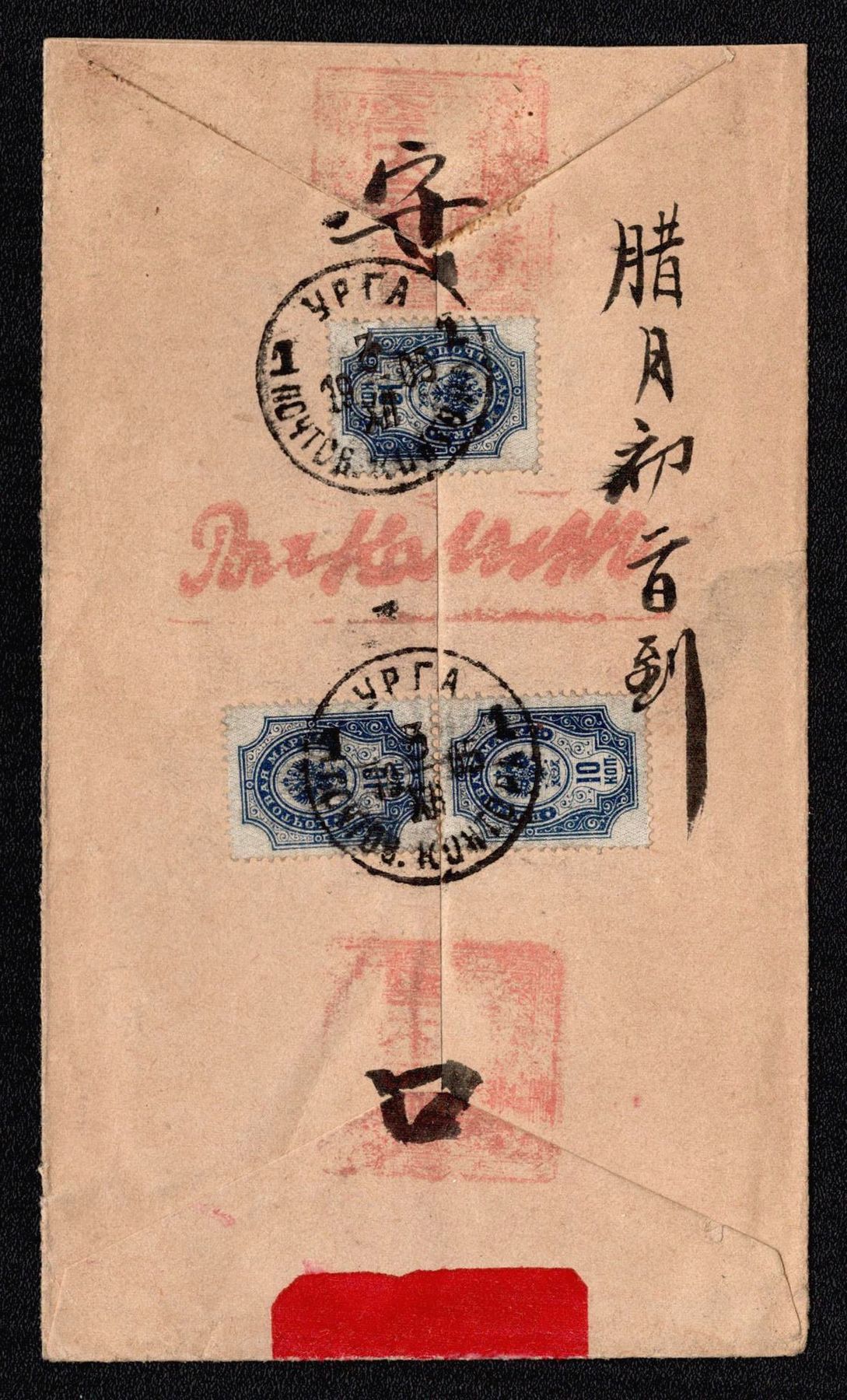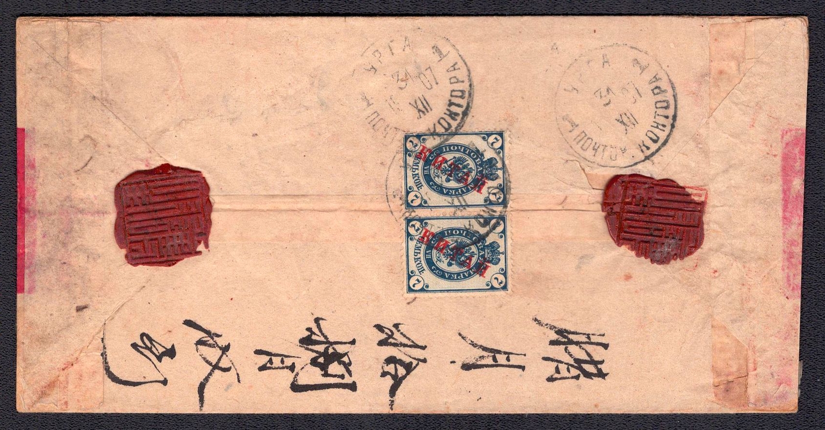 981 image1907 (31 Dec) Russian post office in Mongolia, Red-band cover from Urga franked with a horizontal pair of overprinted 7k 'KITAI' Russian blue stamps (Image 1) (Image 2)