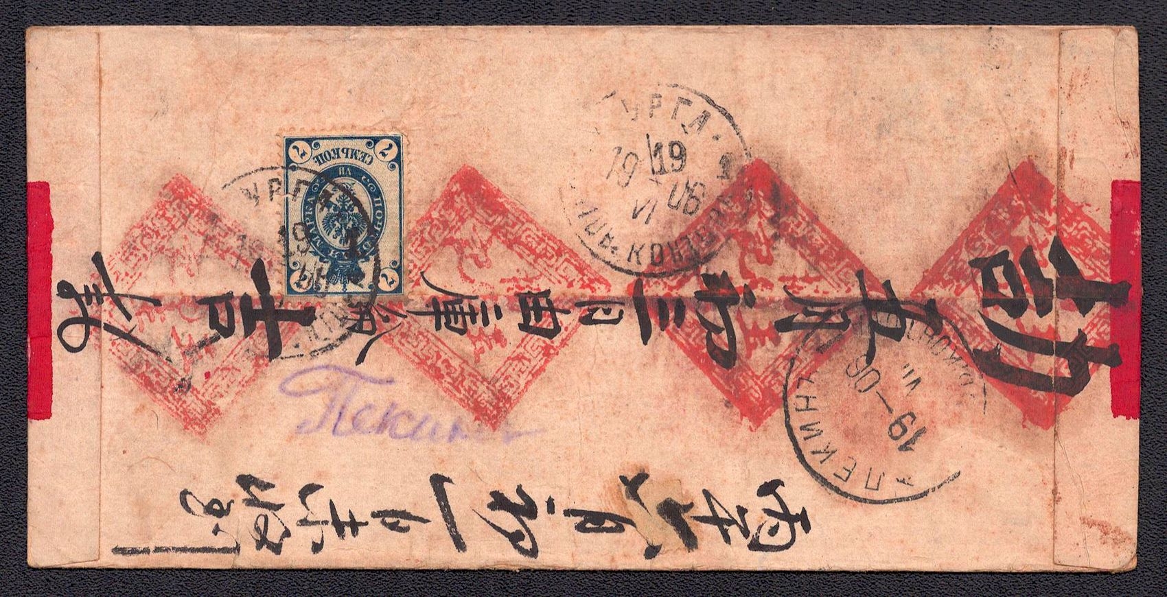 999 image1906 (19 Jun) Russian post office in Mongolia, Red-band cover from Urga to Peking, with rare angled day '19' in the datestamp, franked with 7k Russian Imperial stamp (Image 1) (Image 2)