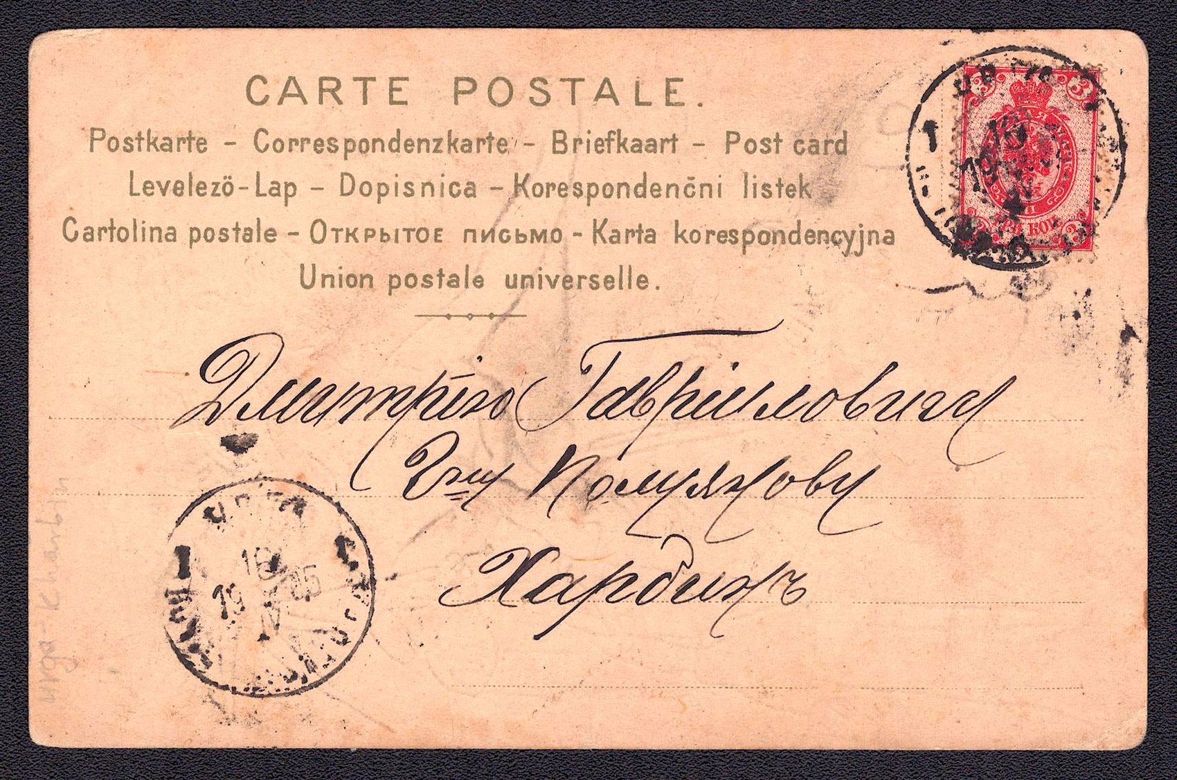 988 image1904 (13 Dec) Mongolia Russian post office postcard from Urga to Harbin, rare slanting date in datestamp, franked with Imperial 3k (Image 1) (Image 2)