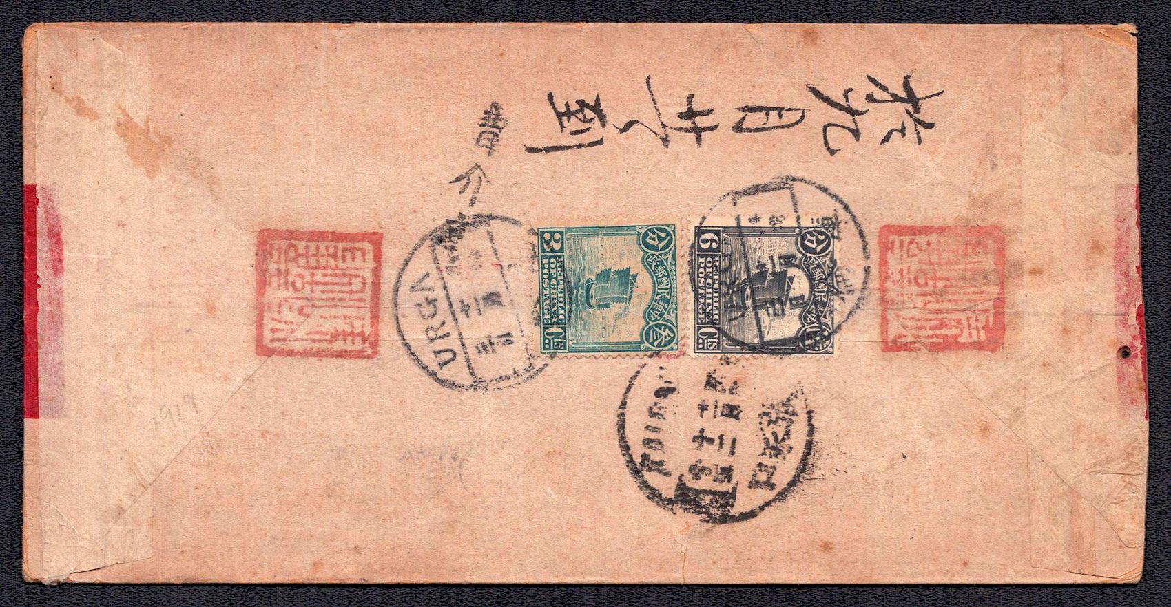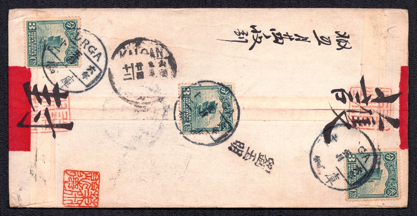 975 image1919 Red-band cover of Chinese post office in Urga (Mongolia) to Kalgan, franked with Chinese 'Junk' Issue 3 cent and 9 cent. Chinese postal service was beginning to suffer because of warfare between "white" and "red" forces in Russia was spilling over into Mongolia. By 1921 China closed it's offices there and regular postal service came to a halt (Image 1) (Image 2)