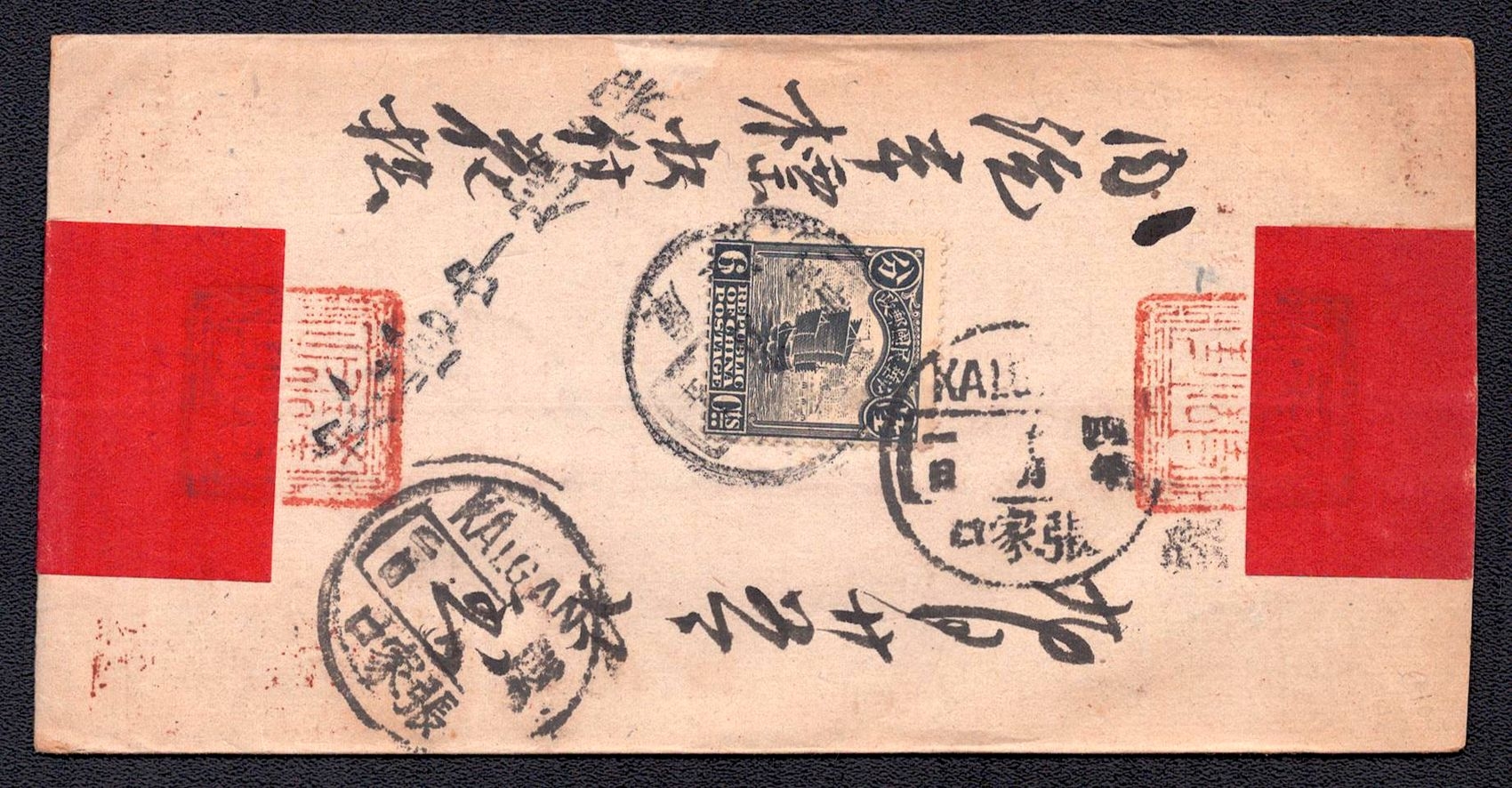970 image1914 Red-band cover of Chinese post office in Urga (Mongolia) to Kalgan, franked with Chinese 'Junk' Issue 6 cent was sent under the Republic of China government which succeeded the imperial regime which ended in 1911 (Image 1) (Image 2)