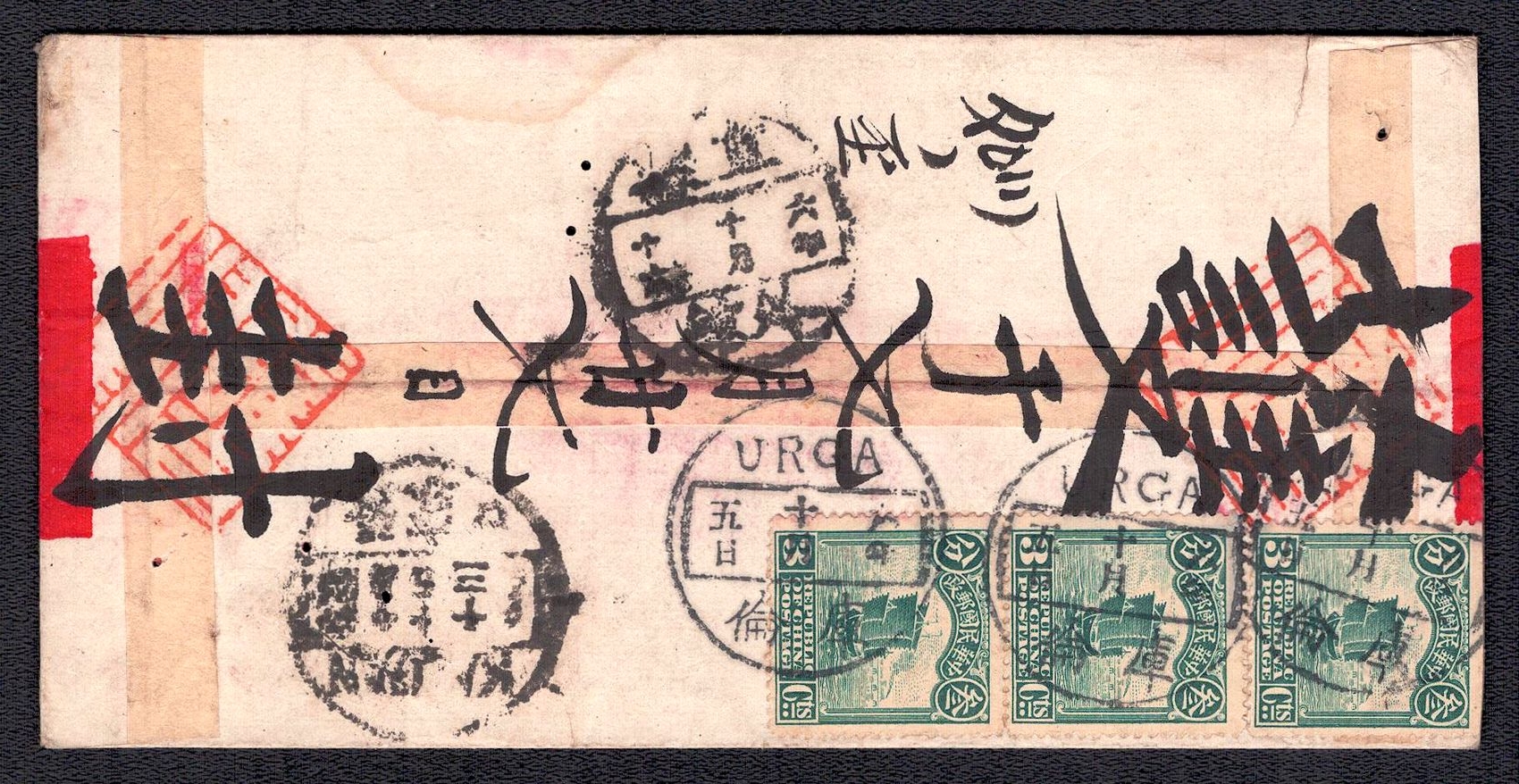 971 image1917 Red-band cover of Chinese post office in Urga (Mongolia) to Kalgan, franked with Chinese 'Junk' Issue 3 x 3 cent. This cover has a different placement of the stamps along the seams of the envelope and act as additional security features (Image 1) (Image 2)