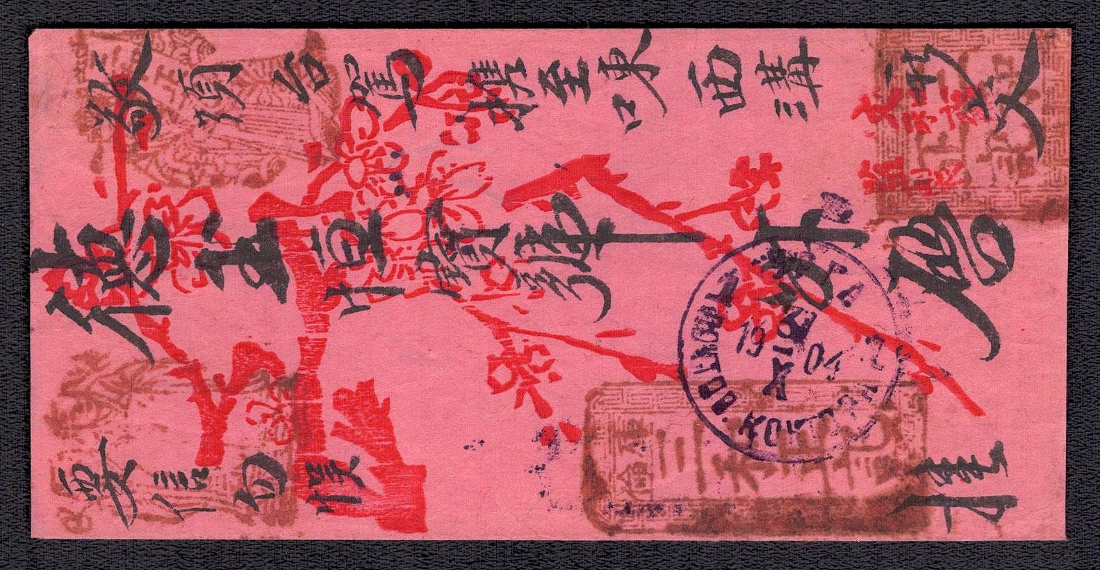 973 image1917 Scarce Disinfected Red-band cover of Chinese post office in Urga (Mongolia) to Peking via Kalgan, franked with Chinese Junk Issue 3x3 cents, disinfection holes (Image 1) (Image 2)
