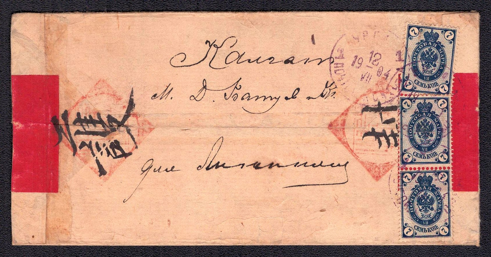 991 image1904 (12 Jul) Russian post office in Mongolia, Red-band cover from Urga to Kalgan, franked with 3 x 7k Russian Imperial stamps, rare violet datestamp, signed (Image 1) (Image 2)
