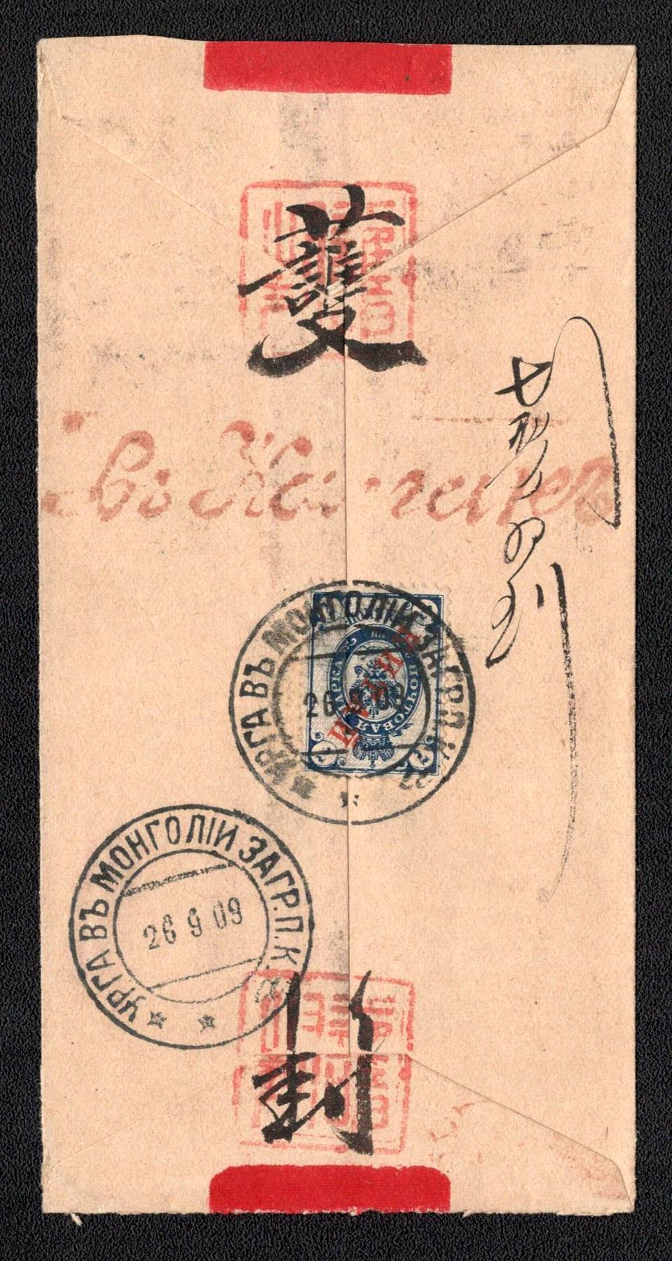 980 Used image1909 (26 Sept) Rare red band cover from Urga to Kalgan bearing on the reverse 1899 issue 7k overprinted 'KITAI' for the Russian PO in China, cancelled with the Urga Type 6 datestamp which is very rare on 'KITAI' stamps. Incorrect date on Kalgan datestamp. Used, (Image 1) (Image 2)