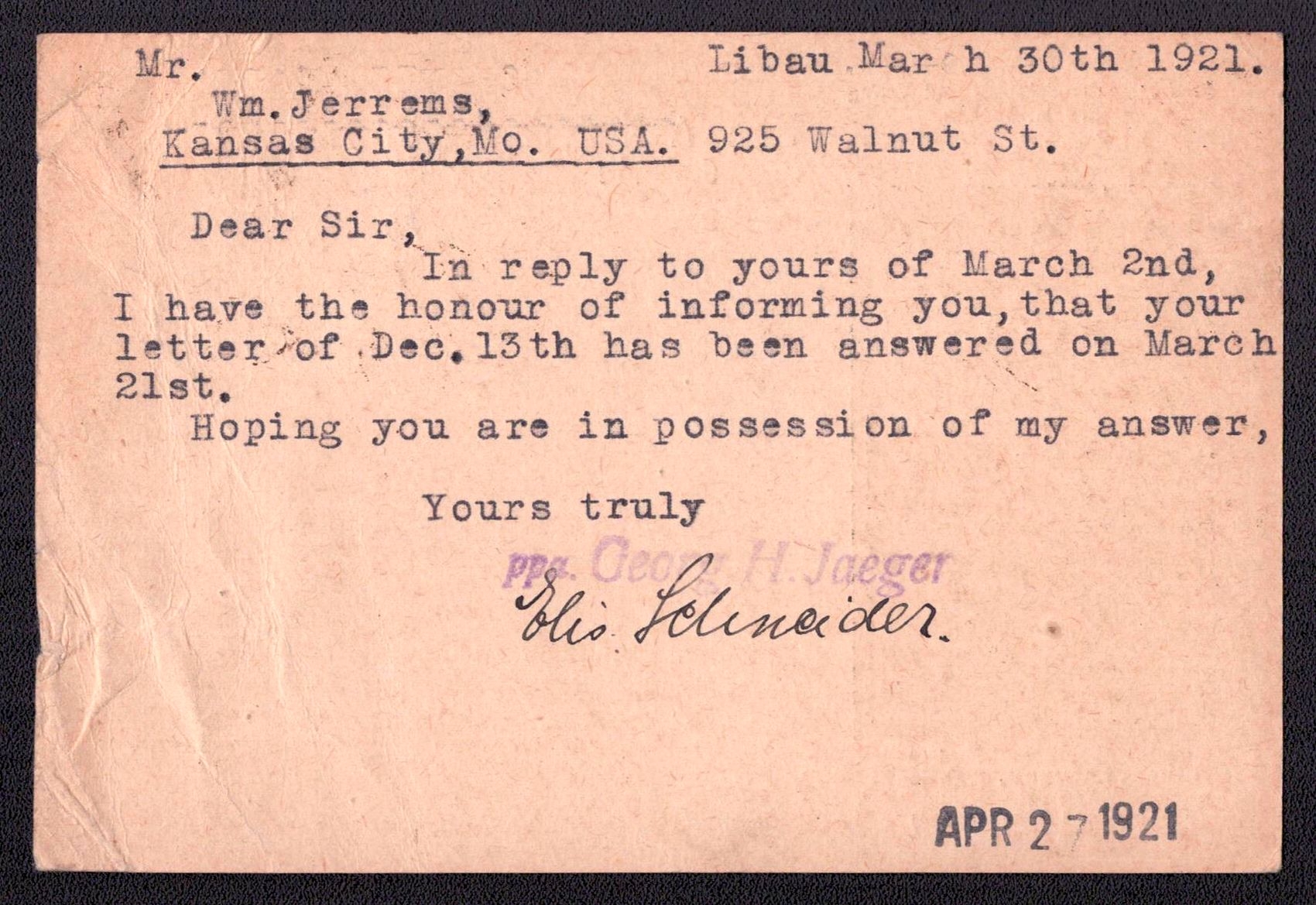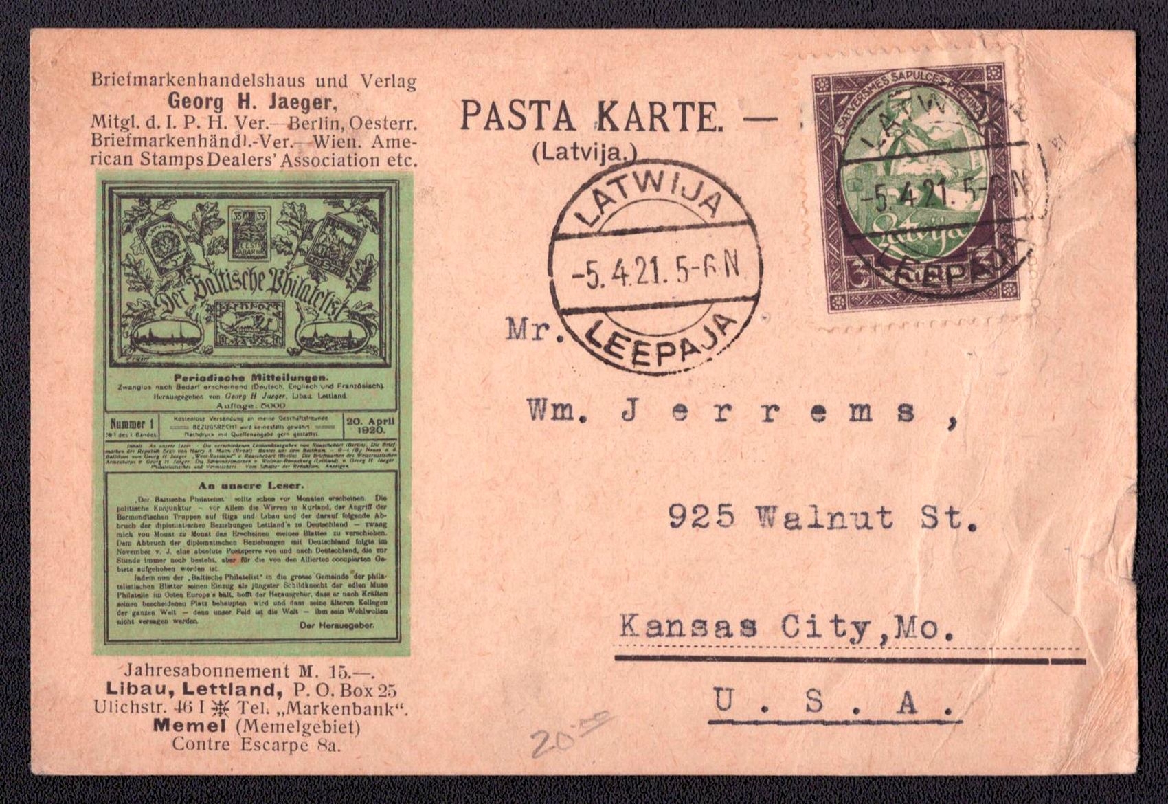 353 image1921, Latvia, international postcard from the seller of stamps Leepaja to USA Sc.72. (Image 1) (Image 2)