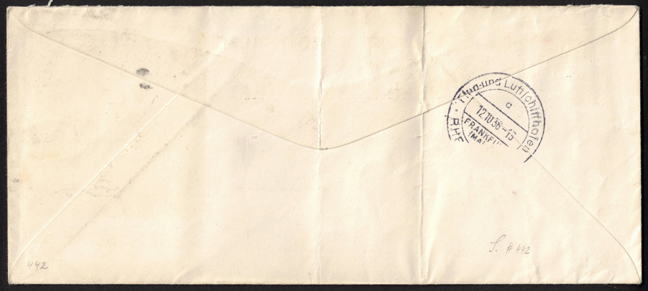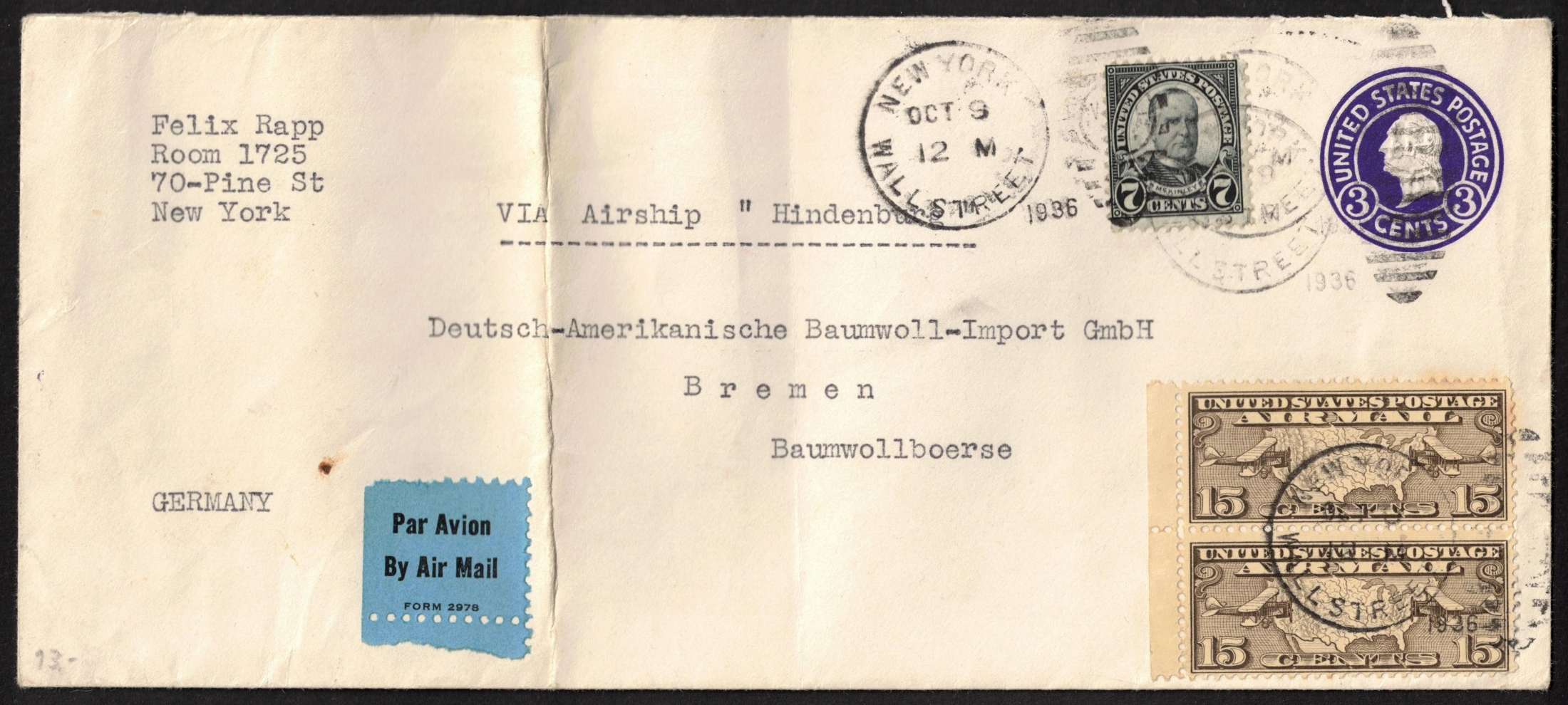 434 image1936 (9 Oct) United States, 3c Zeppelin Airmail Postal Stationery Cover from Wall Street, New York to Bremen via Frankfurt franked with 7c and pair of 12c. , Scott 559, C 8 (Image 1) (Image 2)