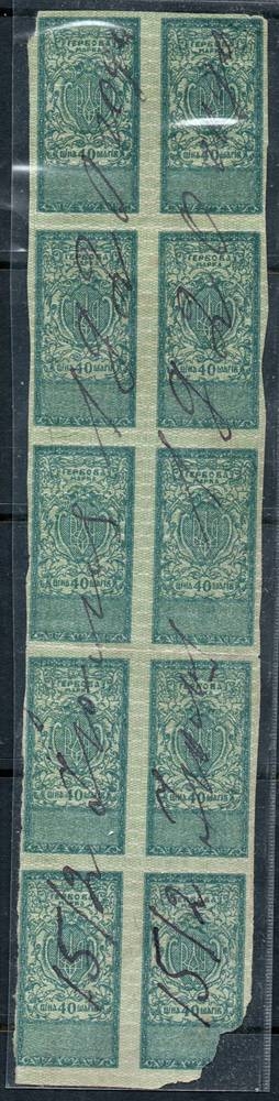 1918 Ukraine, a strip of ten 40sh revenues. Used, Bent, one stamp damaged (Image 1)