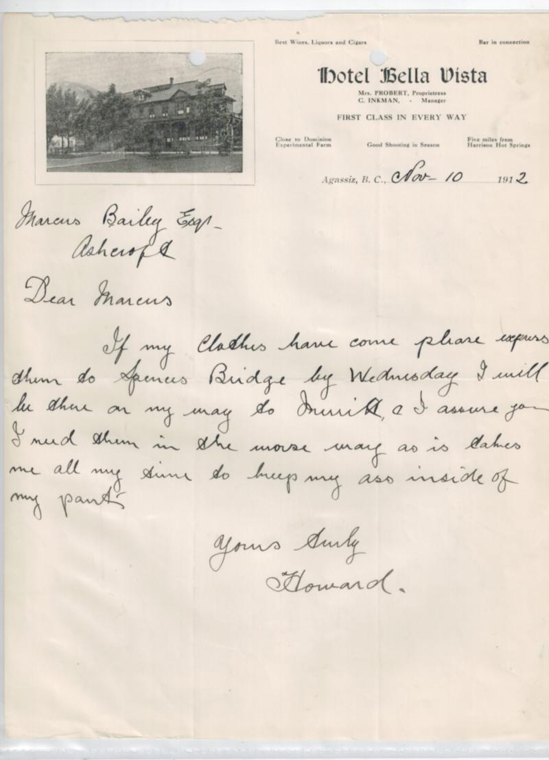 Lot 1 - HOTEL BELLA VISTA LETTER Written at Agassiz, dated 1912. Picture of hotel at top of letter head. Read the letter! Very Funny.... Currently C$ 0