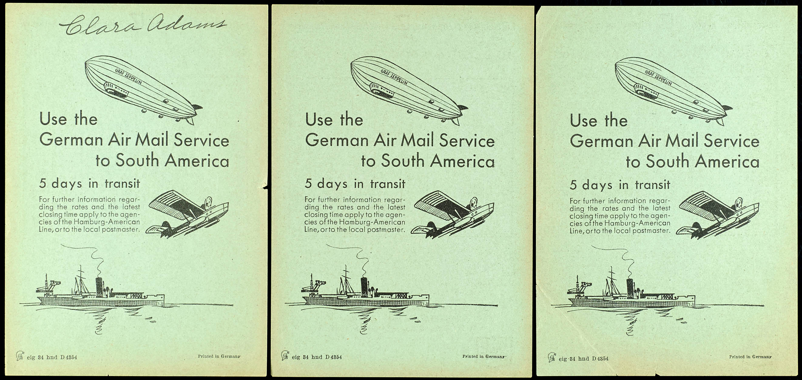 1934, flyer \Use the German AIR MAIL SERVICE to SA¼damerika\, 3 examples, of it of a with autograph Clara Adams 1934, Flyer \Use the German Air mail Service to South America\, 3 Exemplare, davon eines mit Autograph Clara