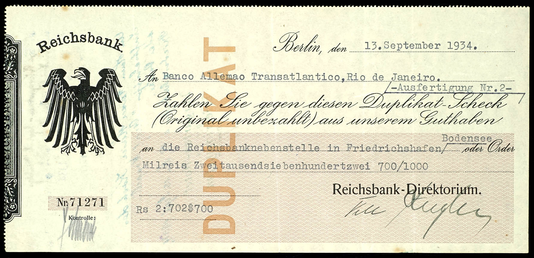 \Graf Zeppelin\, Reichsbankscheck-Duplikat zur Verwendung auf der 8. Südamerikafahrt 1934, ausgestellt in brasilianischer Währung mit 2 Indossamenten, zuletzt an X. Maier, Koch an Bord des Luftschiffes \Graf Zeppelin\