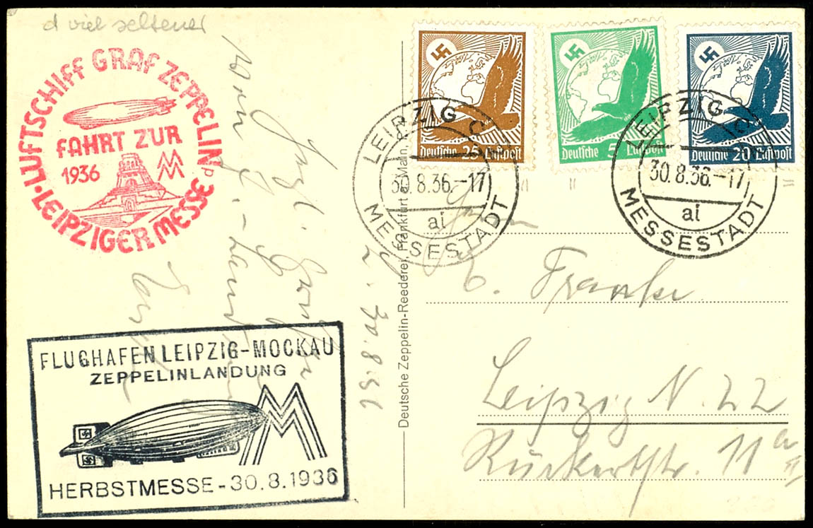 privatem schwarzen Kastenstempel \FLUGHAFEN LEIPZIG - MOCKAU / ZEPPELINLANDUNG / HERBSTMESSE 30.8.1936\ ab Leipzig 30.8.